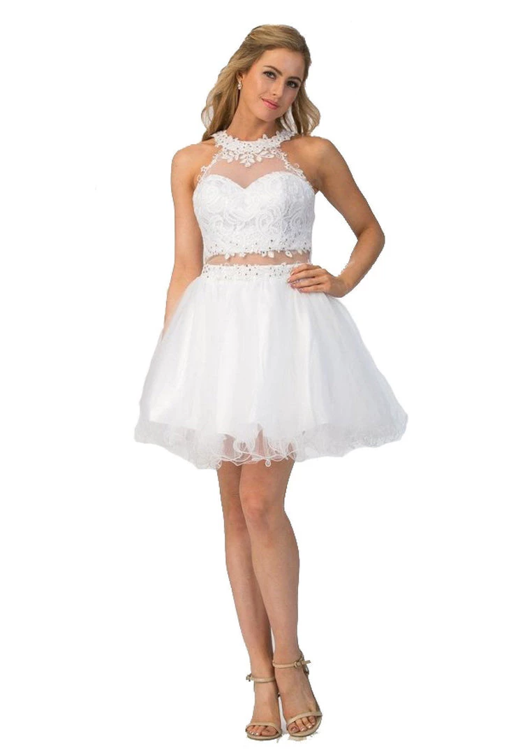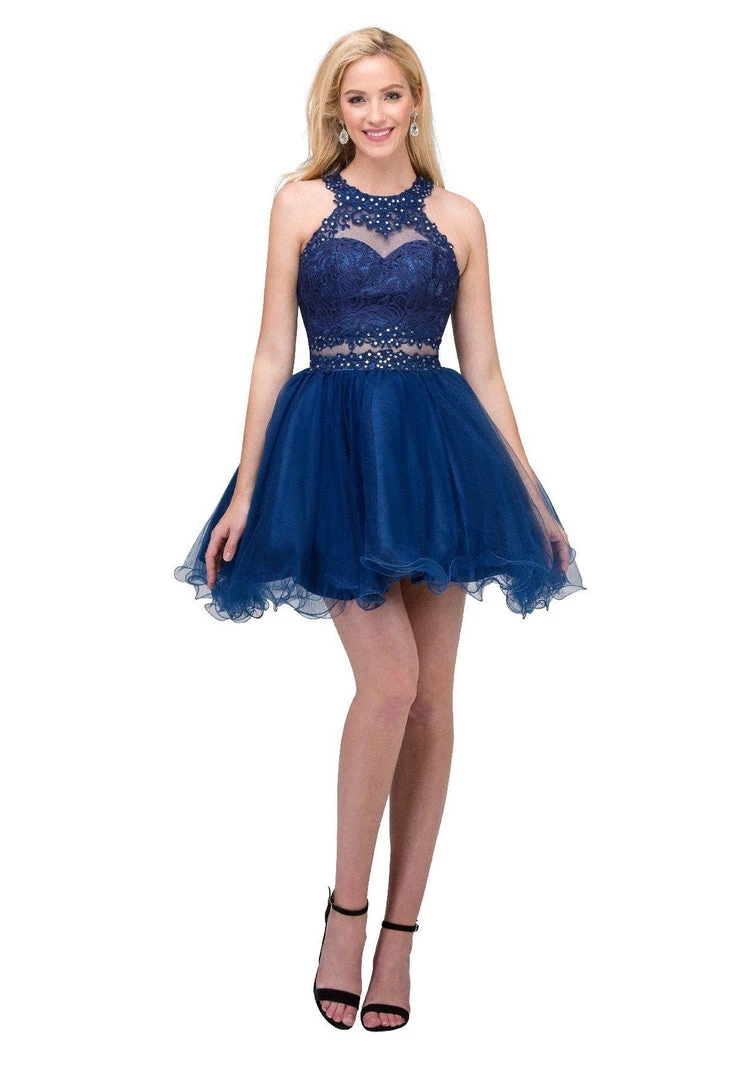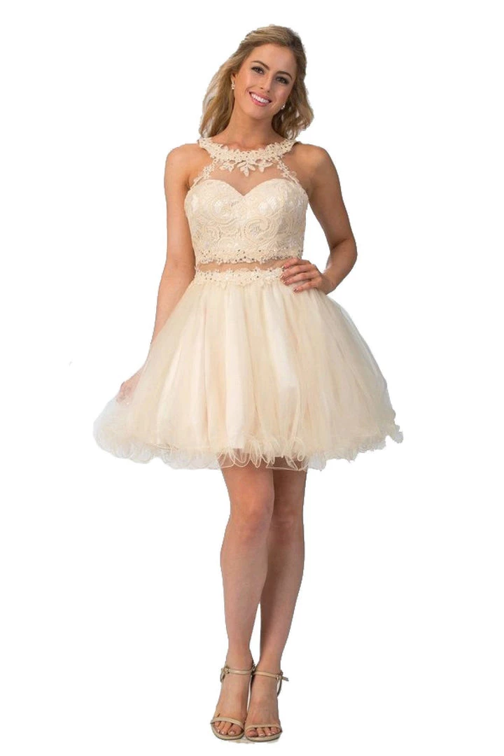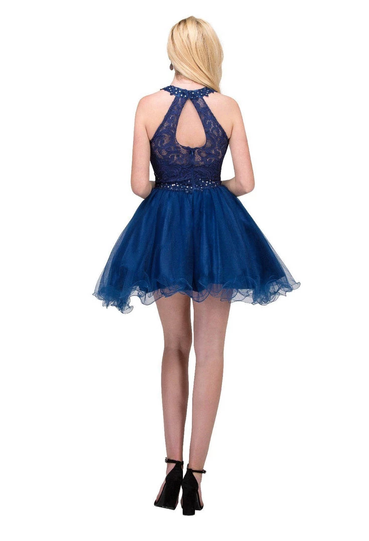 Be the center of attention in this mock two-piece lace cocktail dress with ruffled skirt by Star Box 6417. This beautiful short dress features a high-neck halter lace bodice with a sheer sweetheart neckline, bead embellished sheer waist, flirty open back with cutout, poofy short ruffled skirt with curly hemline, and a zipper closure. Affordably priced at $135, this short party dress is perfect for any formal event and will keep you on budget!
