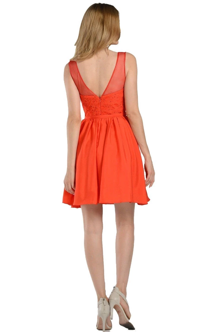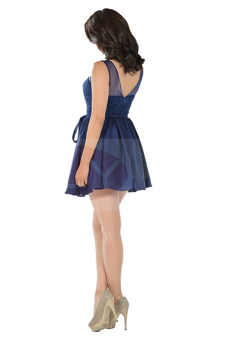 Look super cute in this navy blue short A-line dress with illusion lace applique bodice by Poly USA Style Number 7500. This cocktail dress features a sleeveless illusion mesh bodice embellished with lace appliques and stones. A flirty sheer open V-shaped back, a short mini A-line skirt, and a zipper closure complete this beautiful look. Affordably priced under $150, this dress is perfect for any formal event and will keep you on budget!