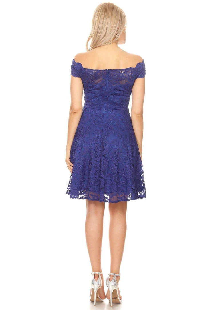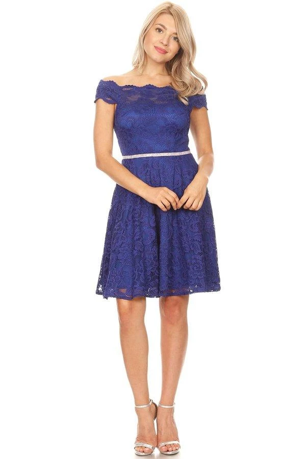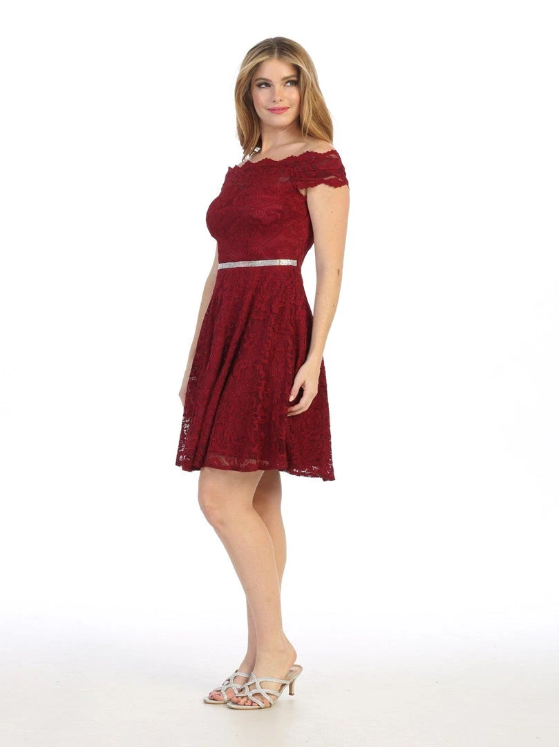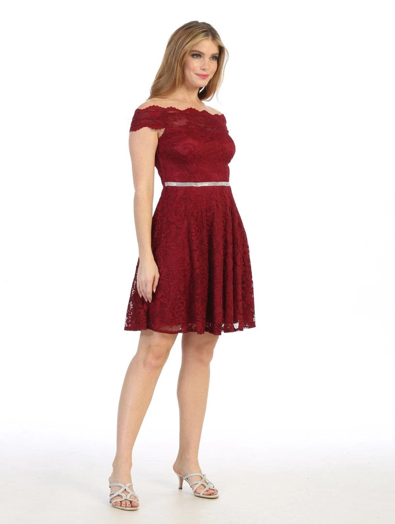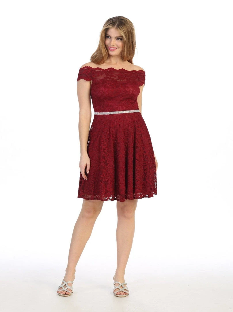 Look unforgettable in this off the shoulder lace cocktail dress with A-line skirt by Celavie 6457. This beautiful short lace dress features a straight across bodice with off shoulder bodice with cap sleeves, rhinestone embellished waistband, short knee length A-line skirt, and a zipper closure. Affordably priced at $120, this short party dress is perfect for any formal event and will keep you on budget!