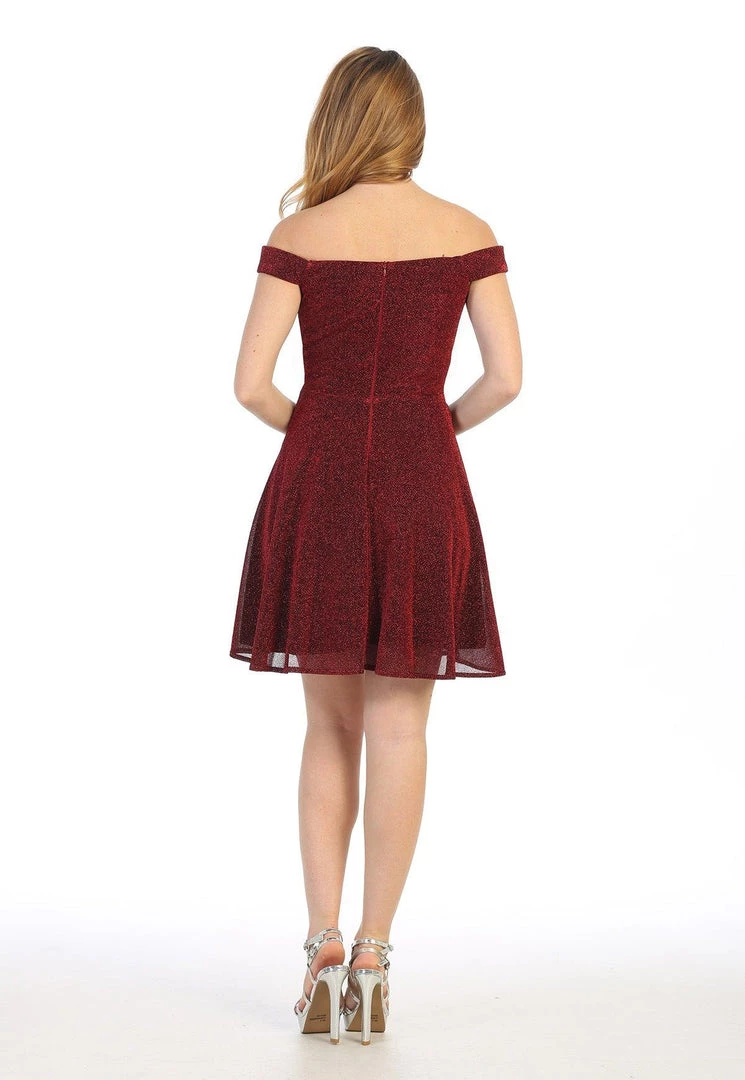 Be selfie ready in this off the shoulder metallic glitter cocktail dress with A-line skirt by Celavie 6402S. Glitter off-shoulder fit and flare dress with short sleeves, straight across neckline, rhinestone embellishment, and a zipper closure. Affordably priced at $120, this short party dress is perfect for any formal event and will keep you on budget!
