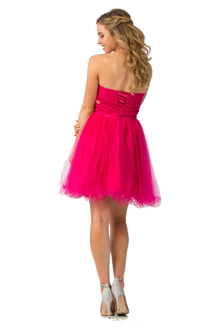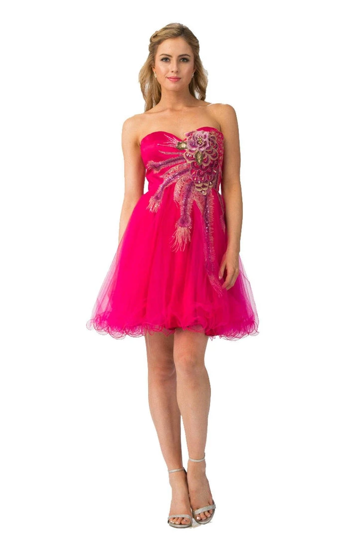 Be a trendsetter in this strapless peacock cocktail dress with corset back by Star Box 5160. This beautiful short dress features a sweetheart strapless bodice embellished with peacock beaded design that gently cascades to the waistline, poofy short ruffled skirt with a curly hemline, and a lace-up corset back with zipper closure. Affordably priced at $139, this short party dress is perfect for any formal event and will keep you on budget!