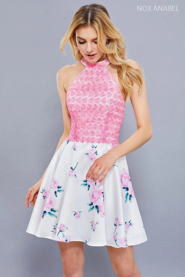 Look pretty in this pink floral print cocktail dress with lace applique bodice by Nox Anabel Style Number 6226. This short party dress features a high-neck halter bodice embellished with beautiful floral lace appliques, short white skirt with lovely pink floral print pattern, and a zipper closure. Perfect for any semi-formal event!