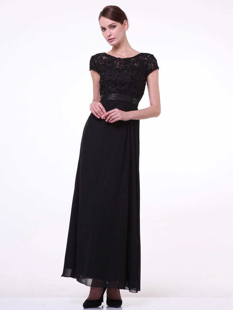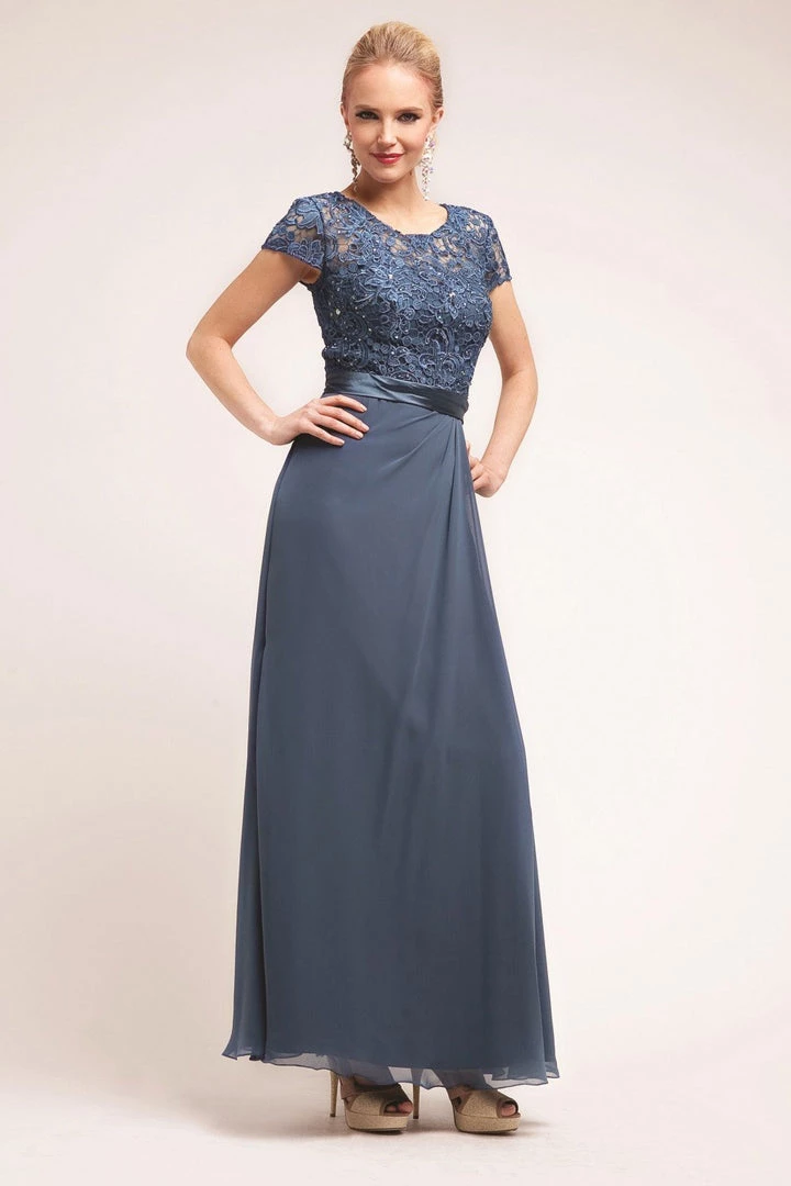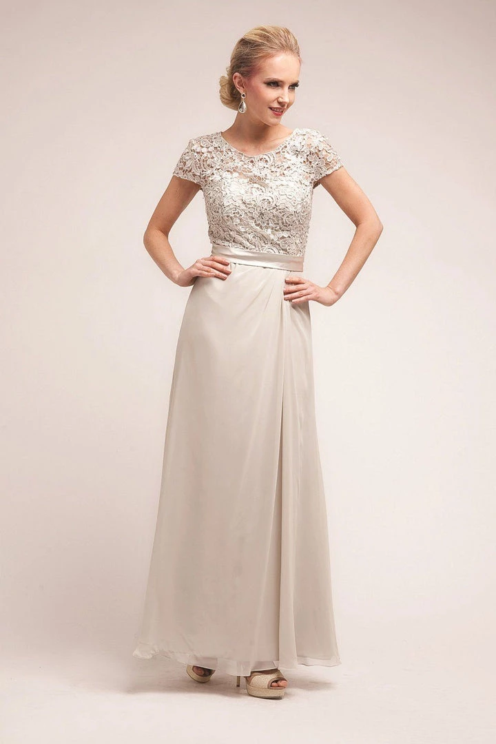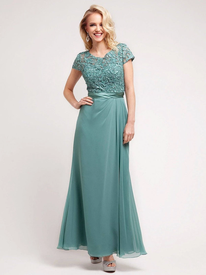 Fall in love with this long lace bodice dress with short sleeves by Cinderella Divine 1922. Shimmery sequin detail the unique lace applique bodice with A-line flowy chiffon floor length skirt for a conservative, classy event.