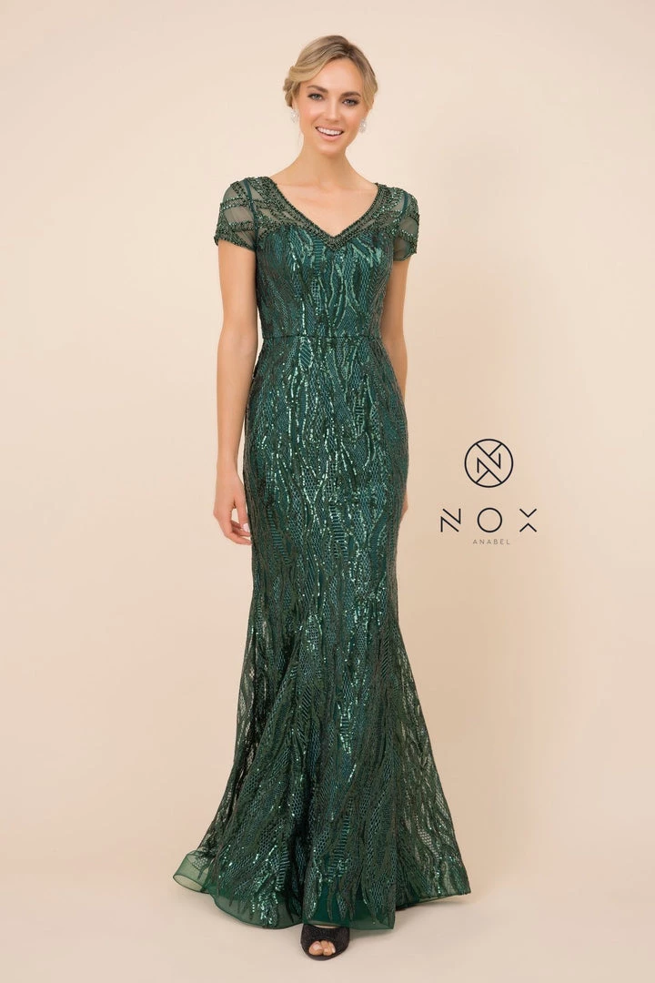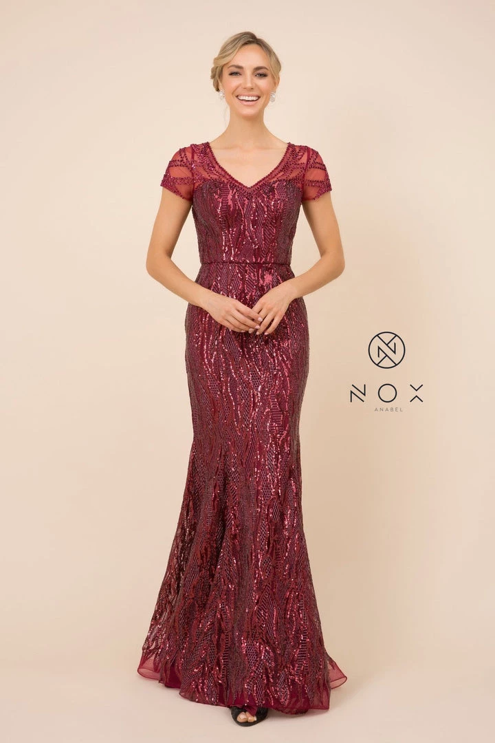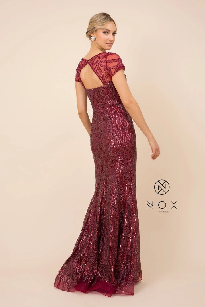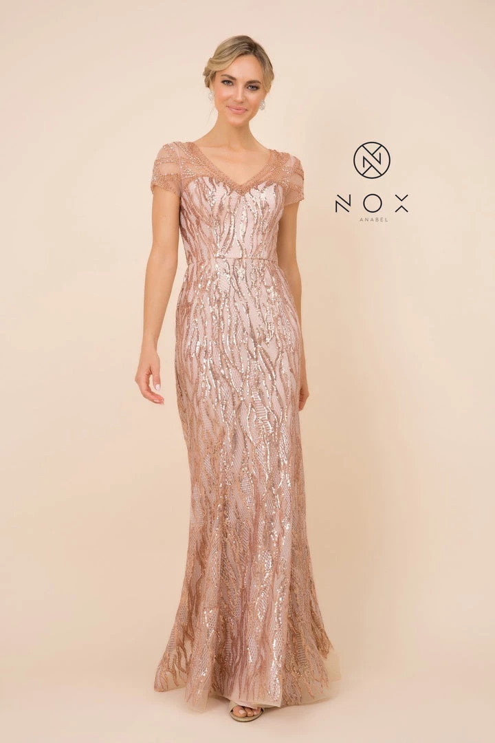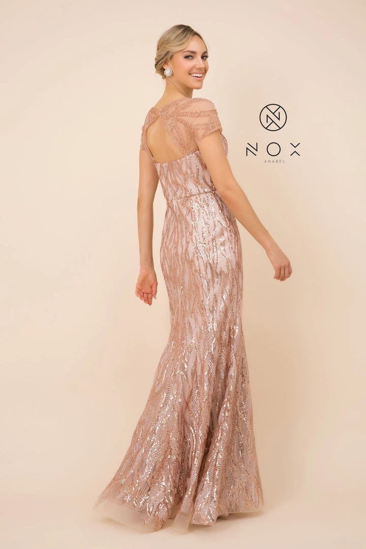 Look radiant in this long fitted sequin print dress with sheer short sleeves by Nox Anabel T419.