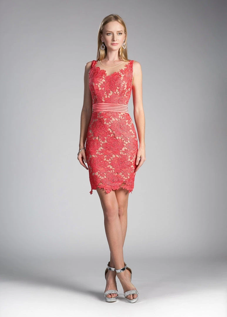 Make a grand entrance in this short sleeveless lace overlay dress by Cinderella Divine CF053. This cocktail dress feature lace overlay with sleeveless bodice and V-neckline. There is a pleated satin sash to accent the waistline and the scalloped above the knee skirt makes this dress sexy and fun.