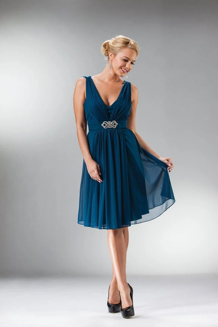 Fall in love with this V-neck sleeveless cocktail dress by Cinderella Divine 3915. Fun and flirty cocktail dress with V-neck, ruched bodice with sparkling jewel details the empire waist. Knee length.