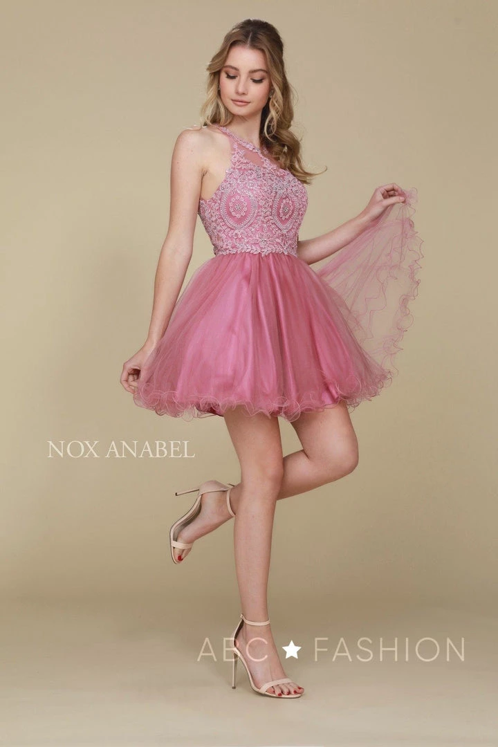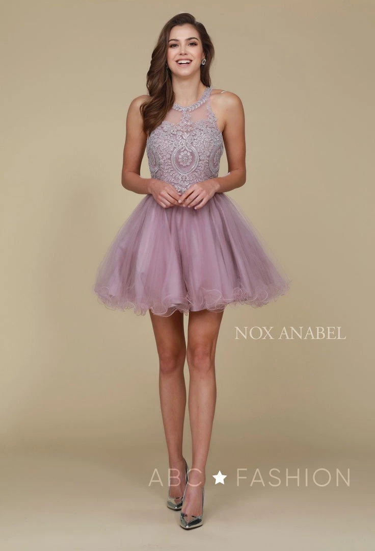 Dance the night away in this sleeveless tulle cocktail dress with embroidered applique bodice by Nox Anabel B652. This short party dress features a sleeveless bodice embroidered with lace appliques accented with sparkly rhinestones, sheer mesh at the high sweetheart neckline, flirty open caged back, the short A-line skirt with rolled hemline falls above the knees, and a zipper back.