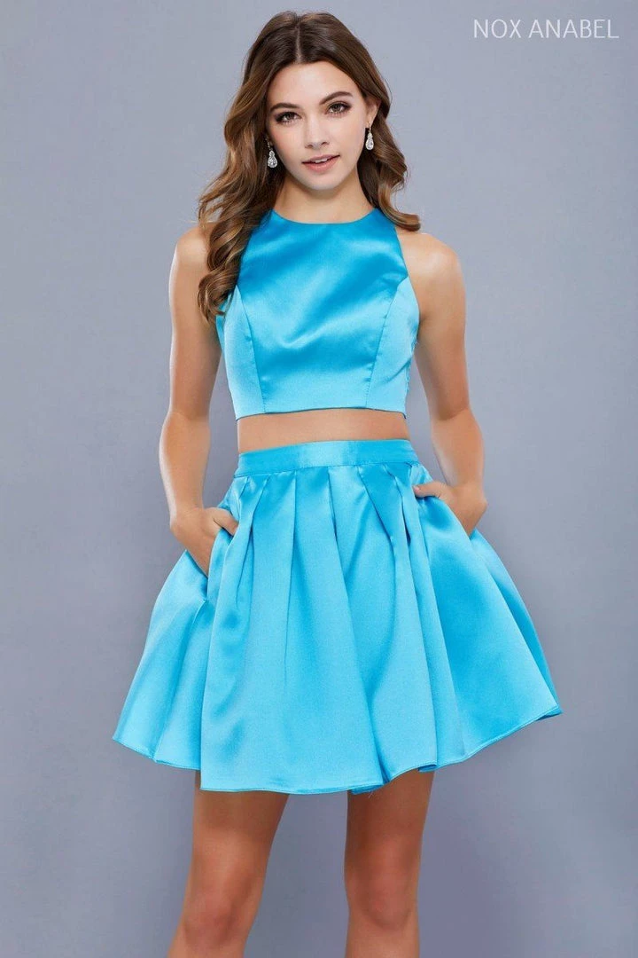 Grab everyone’s attention in this short two-piece dress by Nox Anabel Style 6293 at an upcoming semi-formal event. This short party dress features a high scoop neck sleeveless crop-top bodice, flirty back cutouts create a beautiful open back, side pockets, short box pleated skirt, and a zipper closure.