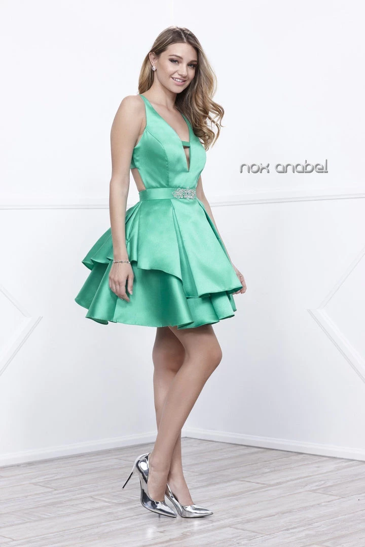 Grab everyone’s attention in this short V-neck cocktail dress with peplum skirt by Nox Anabel Style Number 6283. This short party dress features a V-neck sleeveless bodice, beaded floral detail on the waist, intricately placed cutouts to create a beautiful open back, short peplum skirt, and a zipper closure.