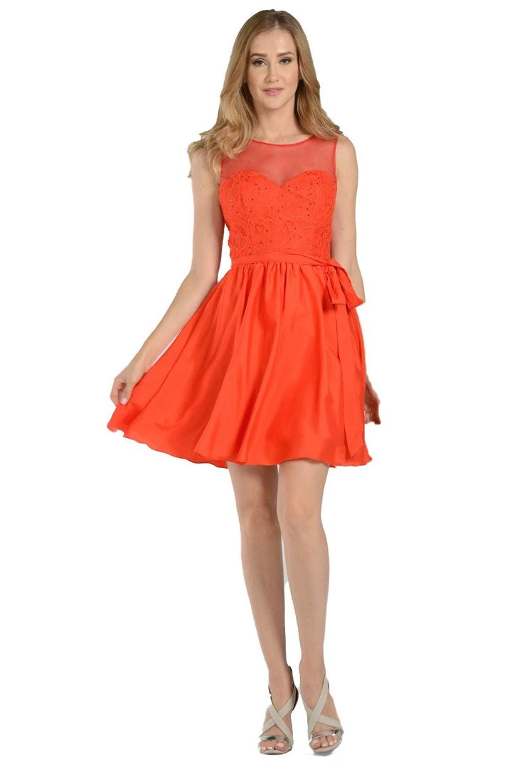 Look super cute in this off-white short A-line dress with illusion lace applique bodice by Poly USA Style Number 7500. This cocktail dress features a sleeveless illusion mesh bodice embellished with lace appliques and stones. A flirty sheer open V-shaped back, a short mini A-line skirt, and a zipper closure complete this beautiful look. Affordably priced under $150, this dress is perfect for any formal event and will keep you on budget!