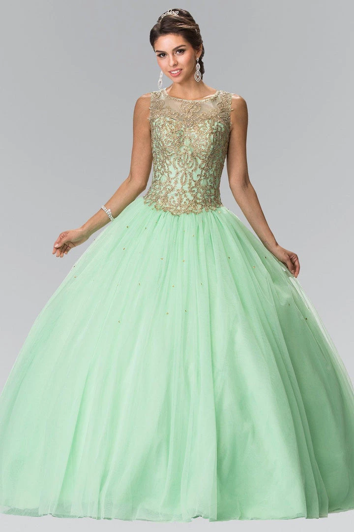 Impress the room in this gold embroidered sleeveless A-line dress by Elizabeth K GL2207. This beautiful gown features a sleeveless illusion neckline, gold embroidered bodice, long A-line skirt, and a lace-up back. This dress includes a bolero jacket.
