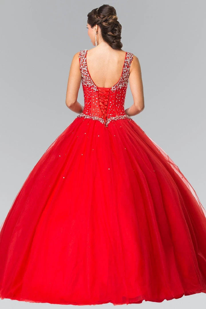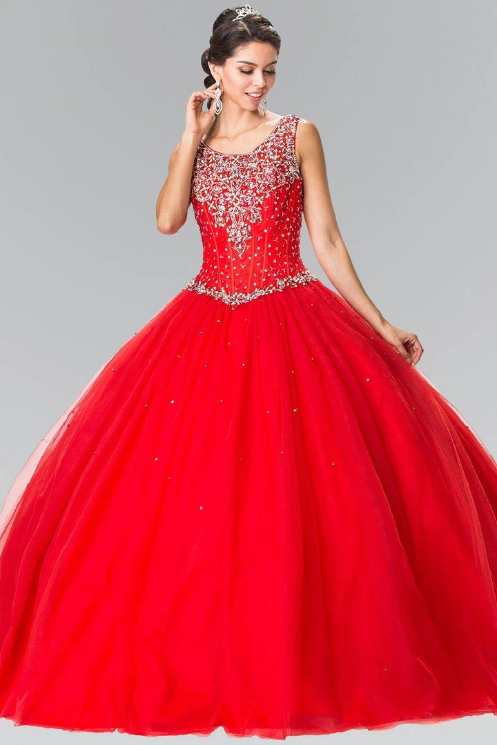 Dance the night away in this beaded sleeveless A-line dress by Elizabeth K Style Number GL2349 during your Quinceanera party or for any formal event. This beautiful gown features a sleeveless neckline, beaded bodice, and a lace-up back.