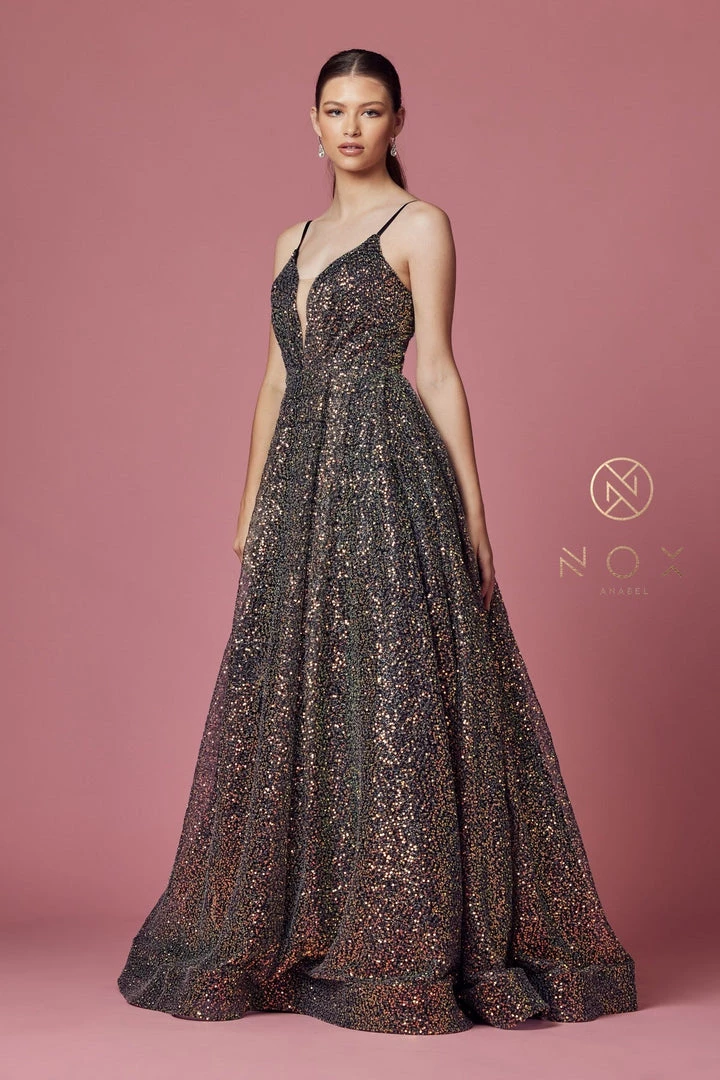 - Sleeveless Iridescent Glitter Gown by Nox Anabel R1030