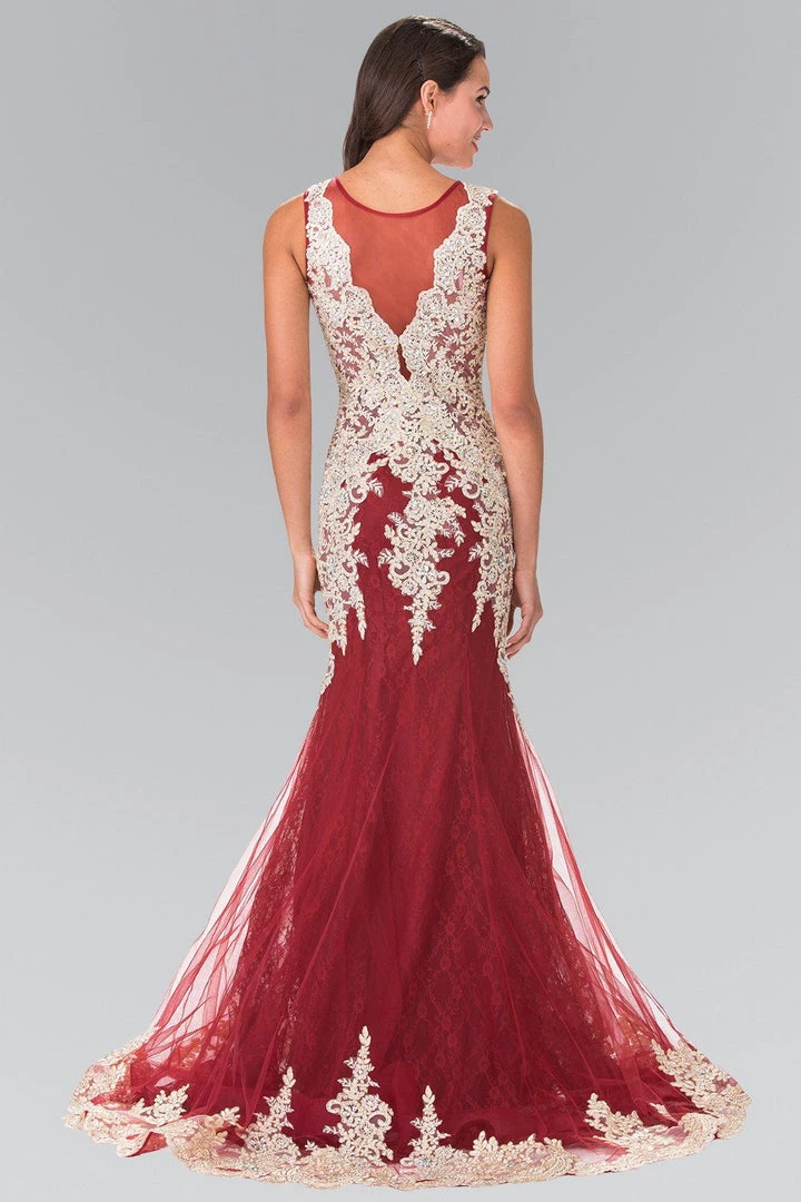 Make a grand entrance wearing this long sleeveless jeweled lace mermaid dress with illusion top by Elizabeth K.