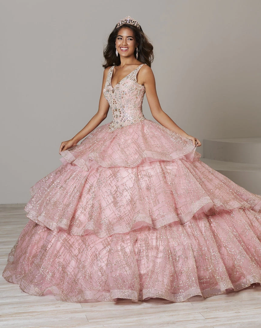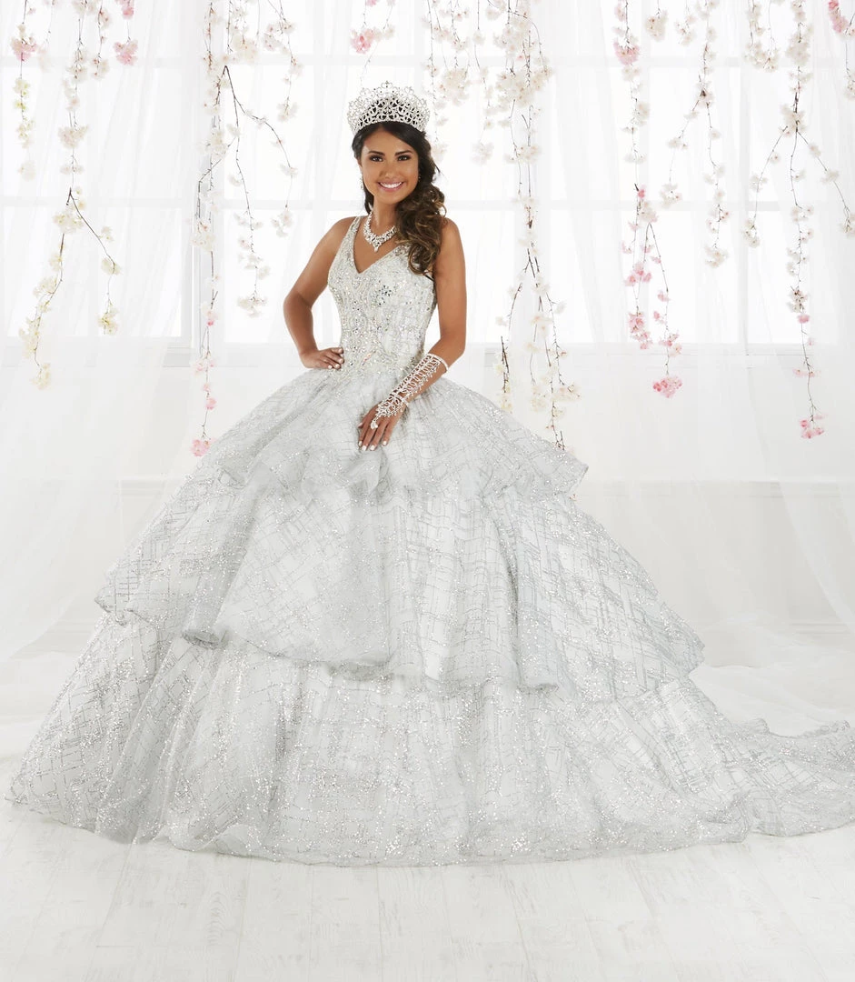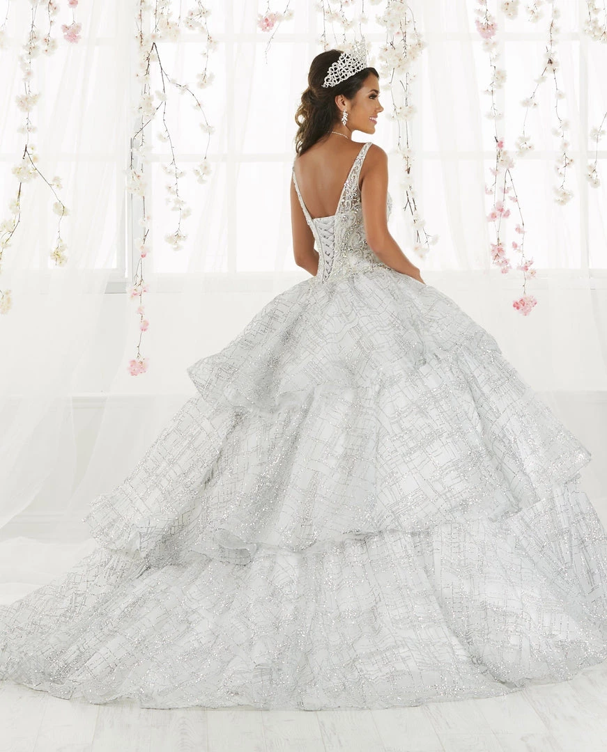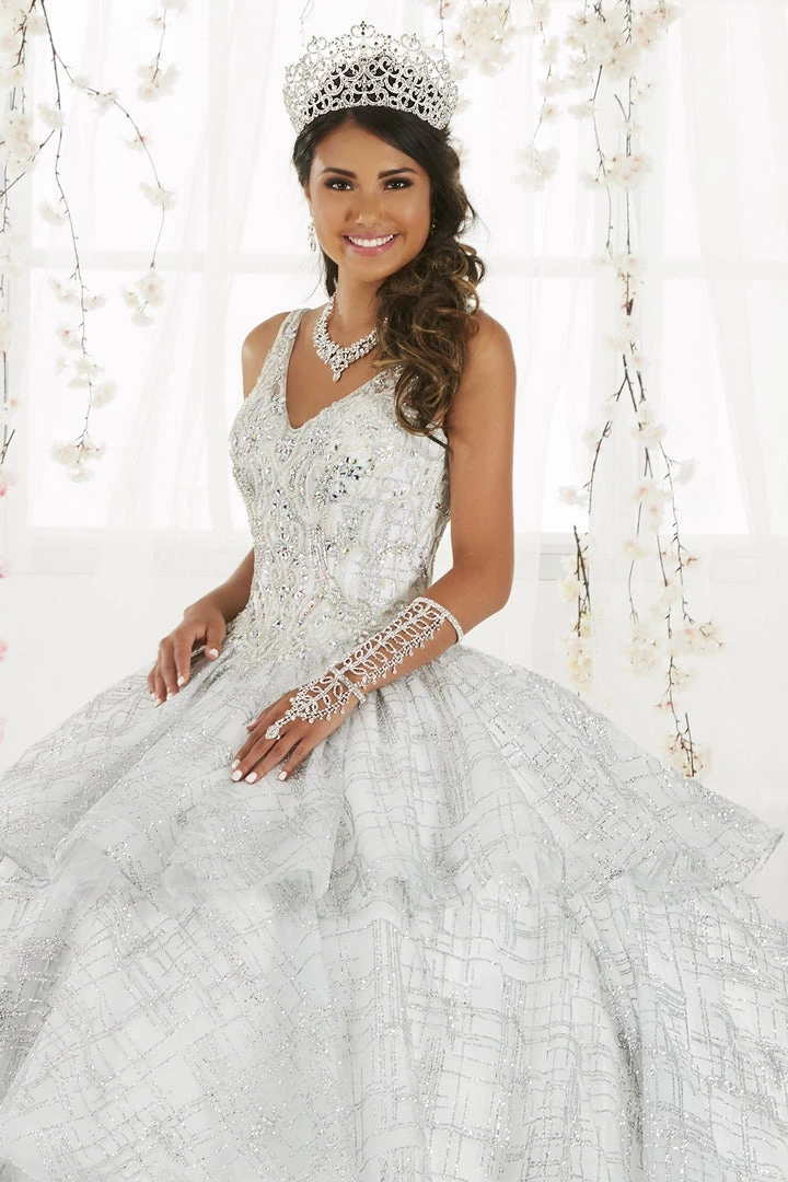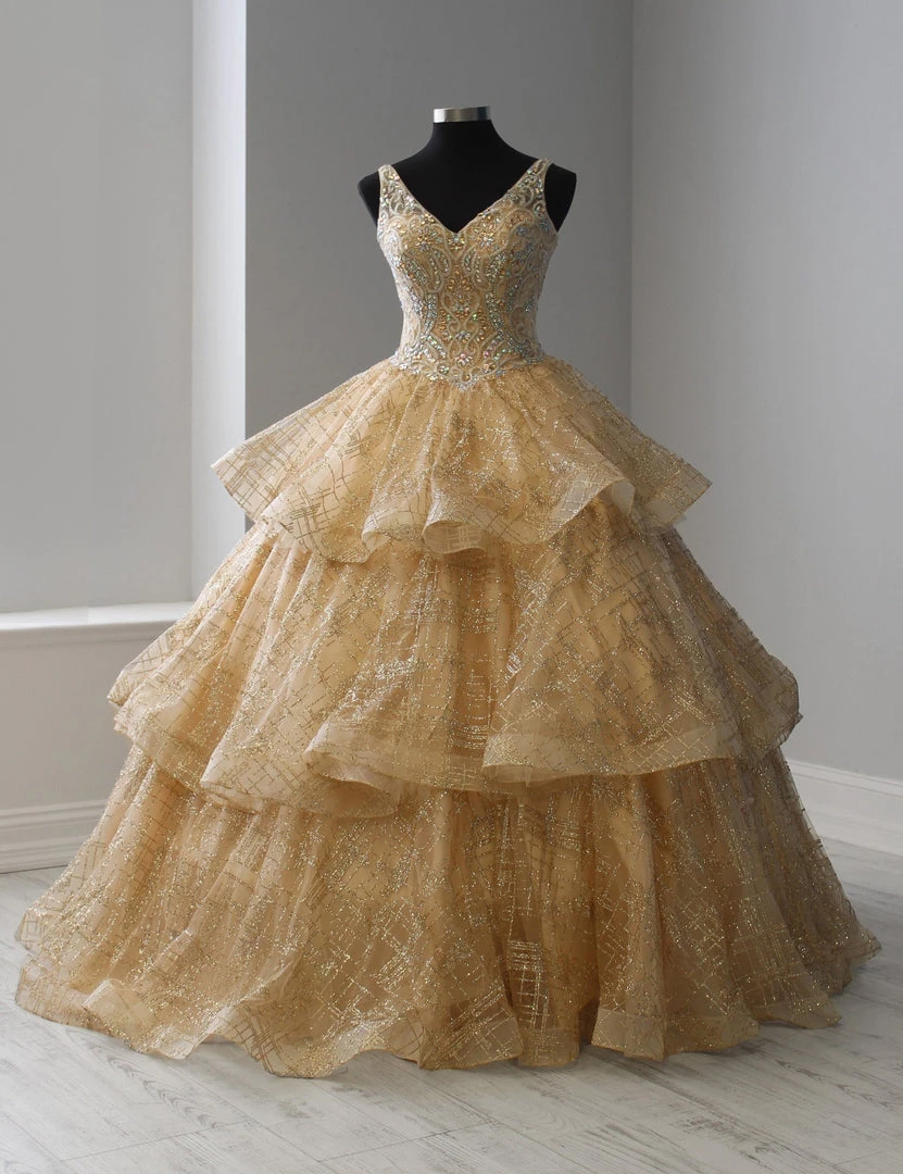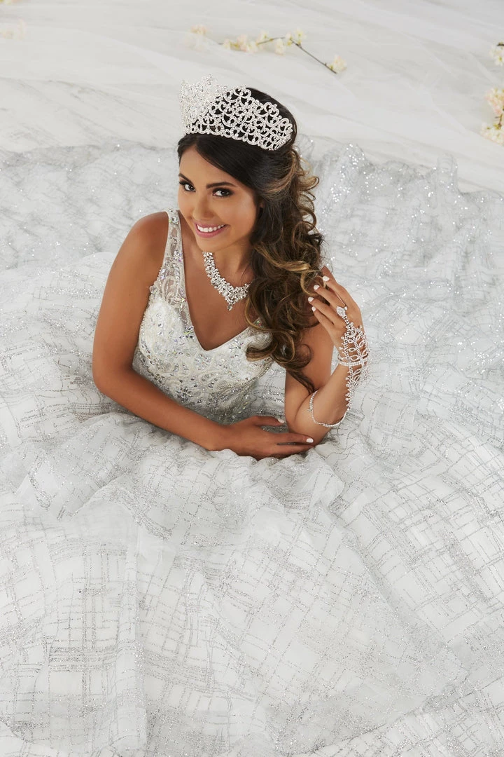 Make a grand entrance in this long glitter dress with tiered skirt by House of Wu 26921 during your Quinceanera, Sweet 16 party, or for any formal event. Sparkle under the stars with this metallic cracked ice ball gown! The sleeveless V-neck bodice features sparkling beading with front and back straps. The three-tiered ruffle skirt is accented with horsehair to add a touch of drama. This look is finished with a corset back and a gorgeous train.
