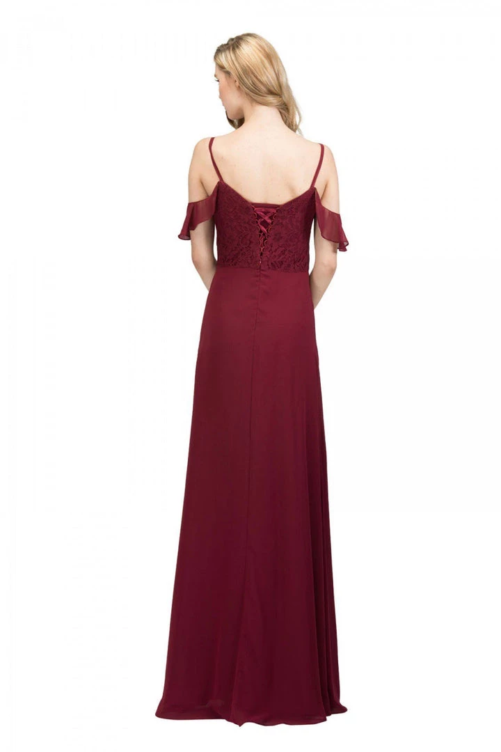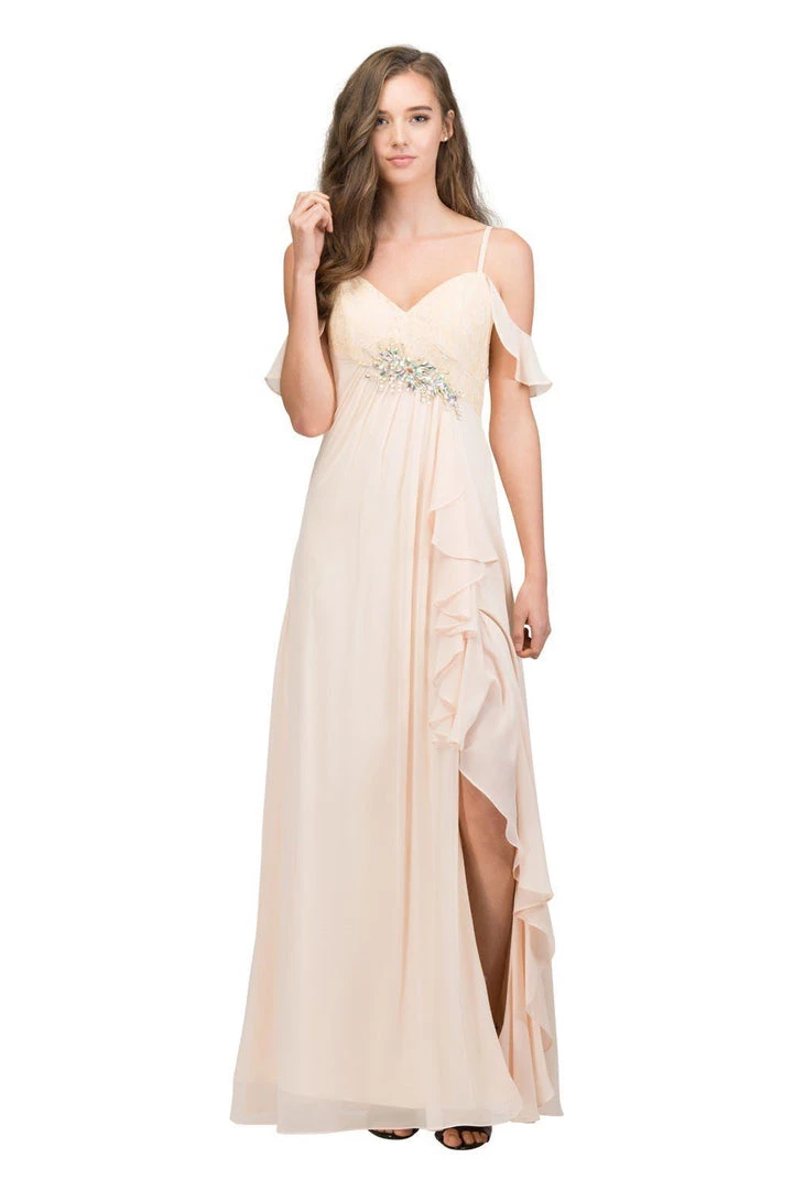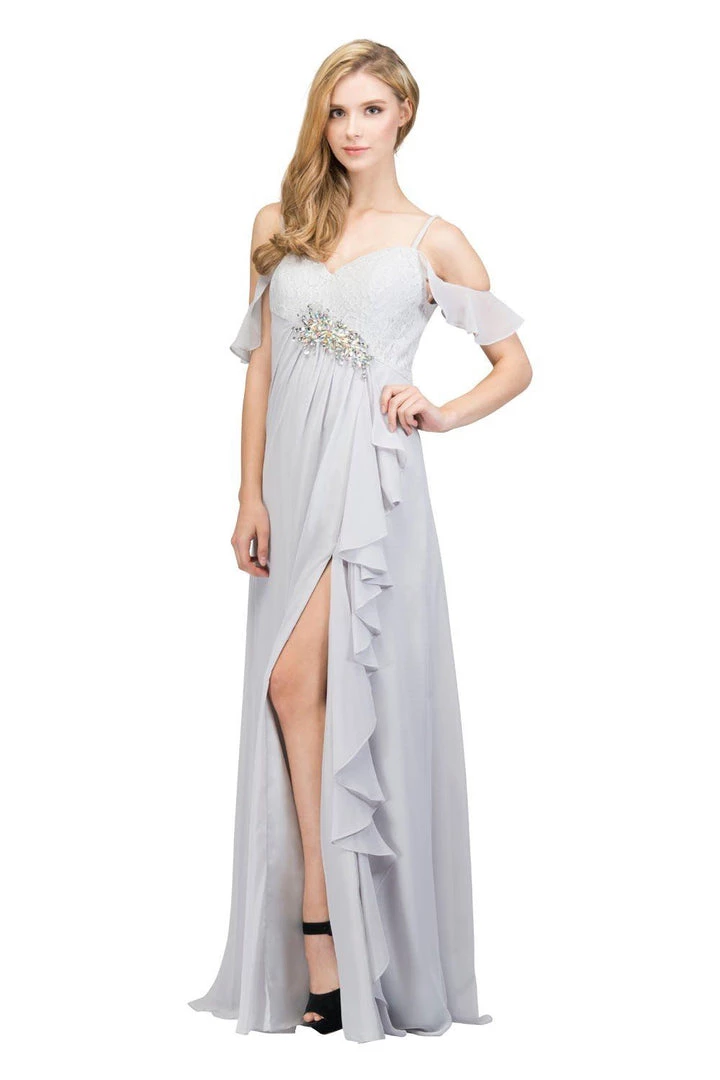 Dance the night away in this long A-line cold shoulder dress with lace bodiceĀ Star Box 81020. Classy chiffon floor-length-off-shoulderĀ ruffled in a spaghetti strapĀ bodice,Ā elegantly designedĀ to shimmerĀ under theĀ eveningās stars.