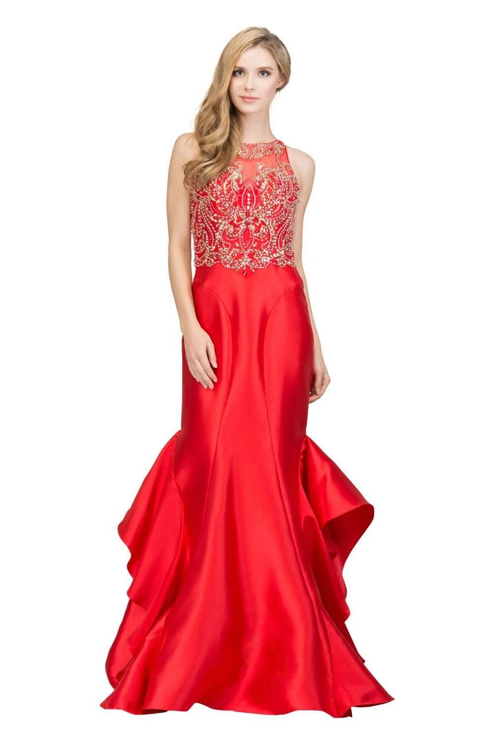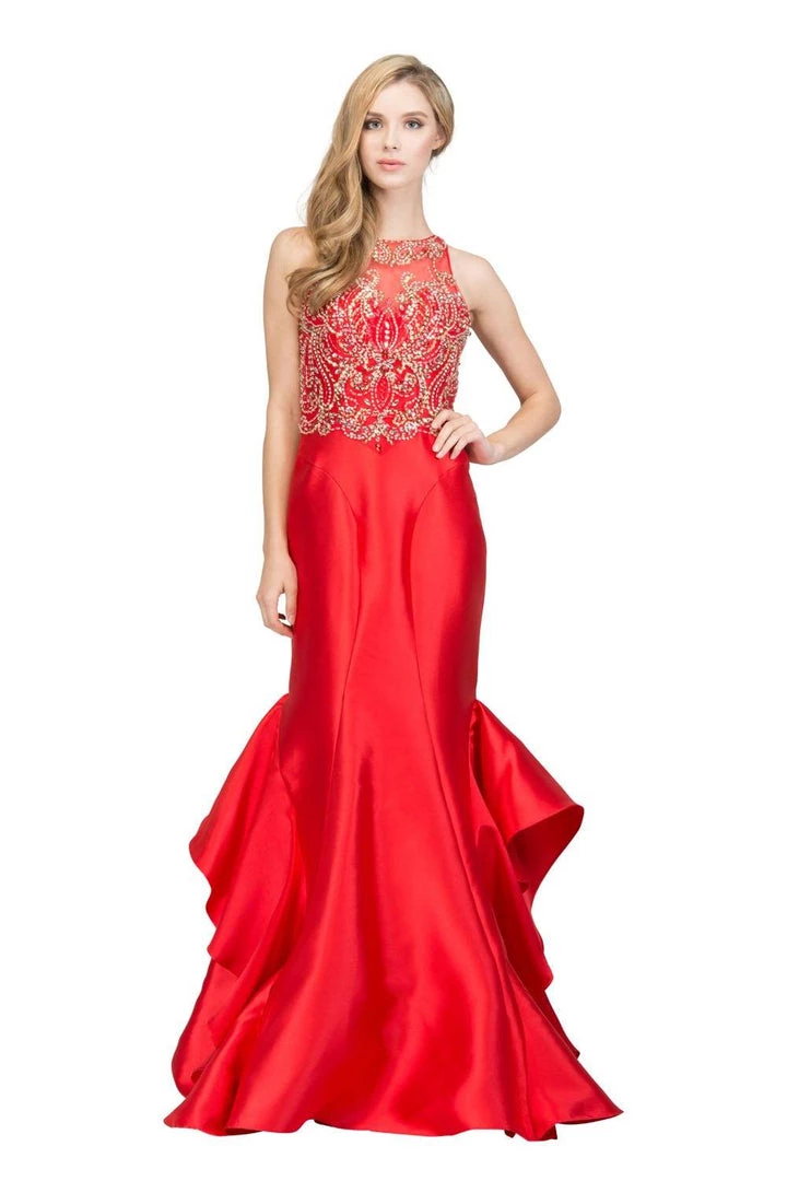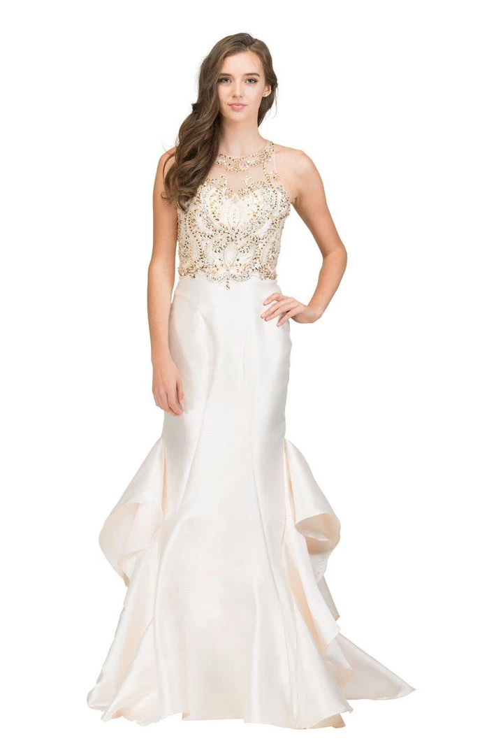 Ravishing mermaid gown flows into an ocean swimming with rose-petal ruffles wrapped in gold.