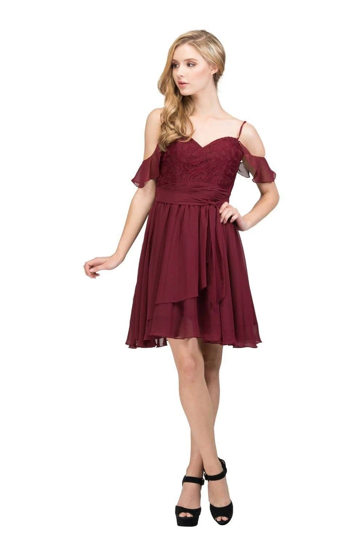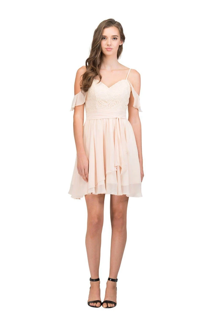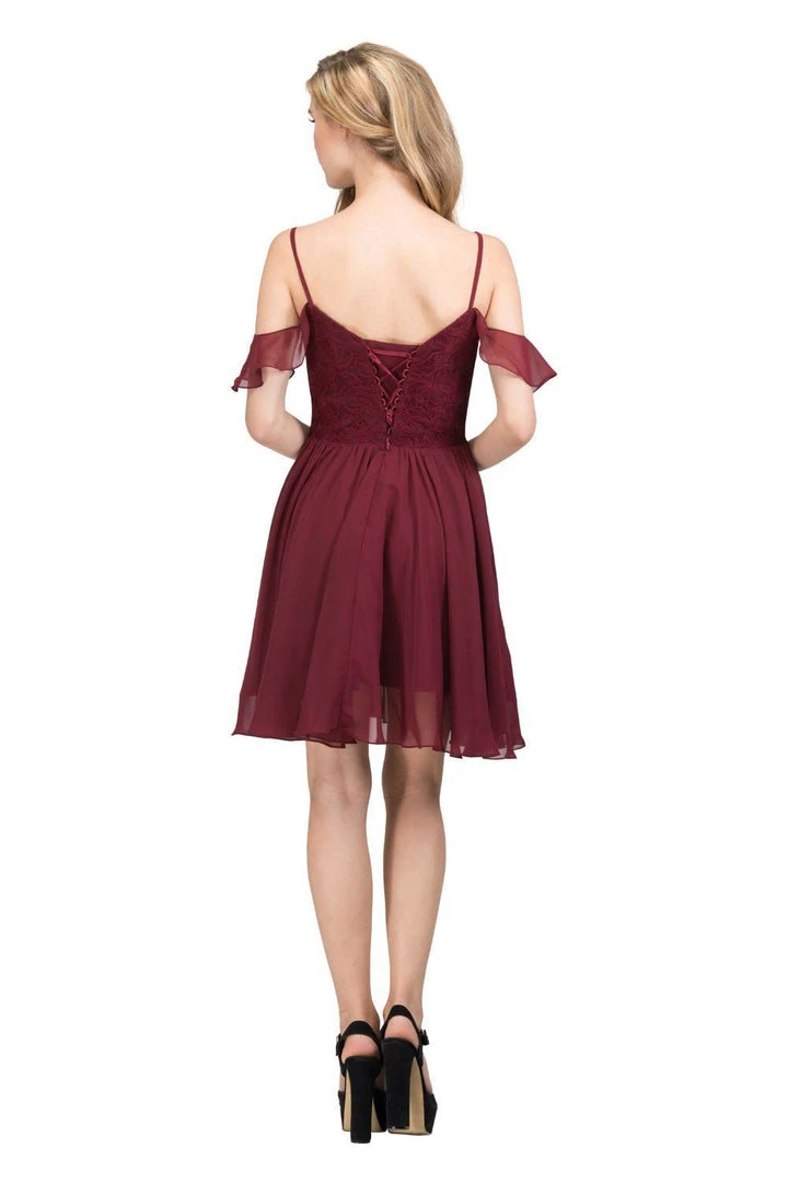 Alluring off-the-shoulder short dressĀ embellished withĀ elegant lace bodice presentsĀ a lovely visionĀ of what dreams mayĀ become.