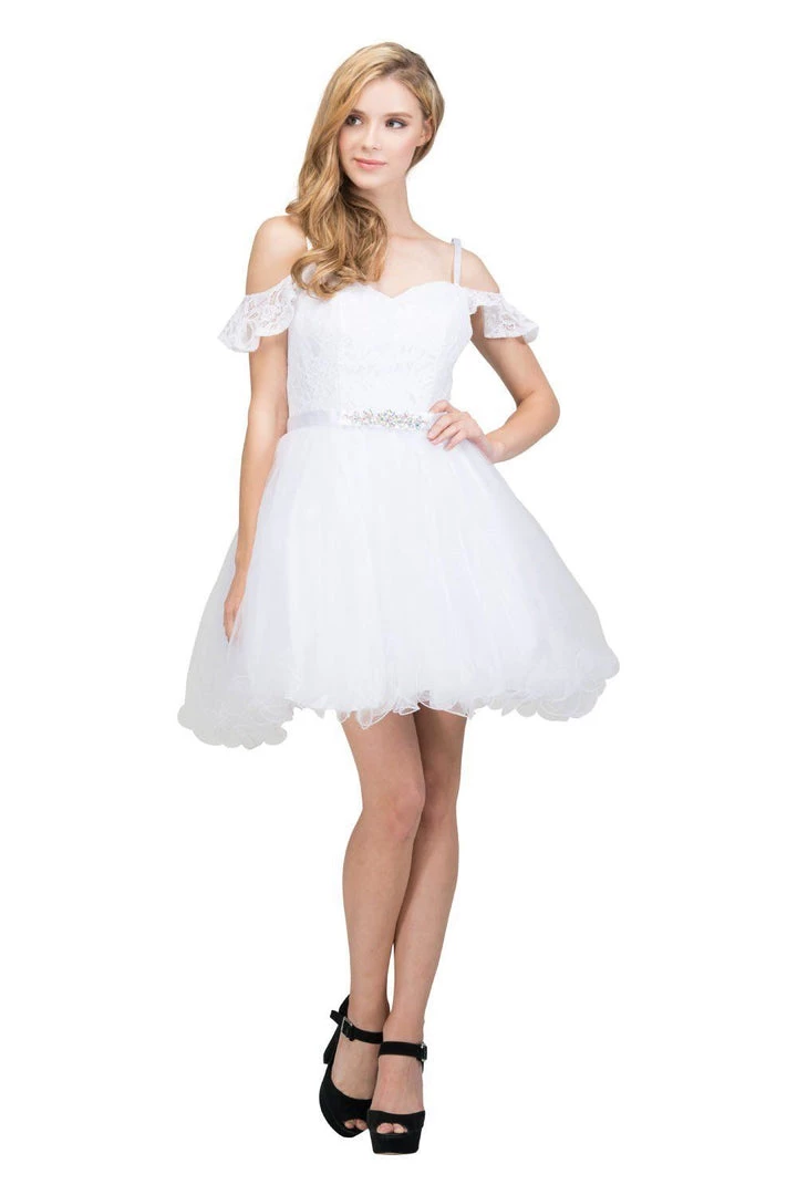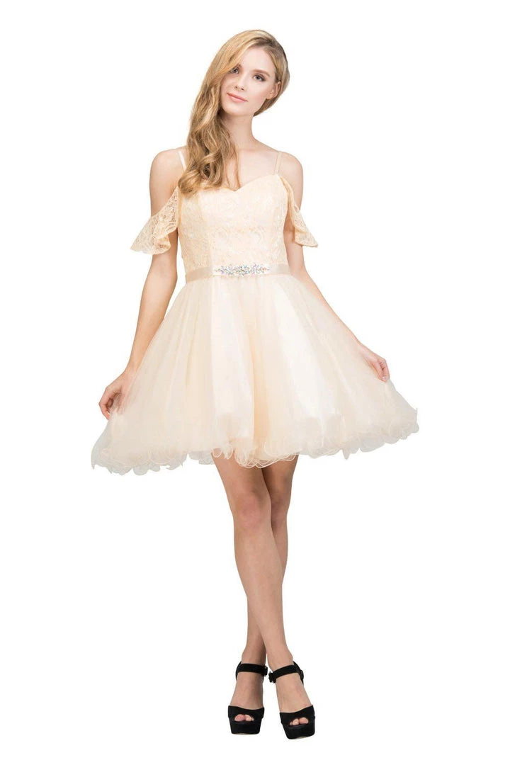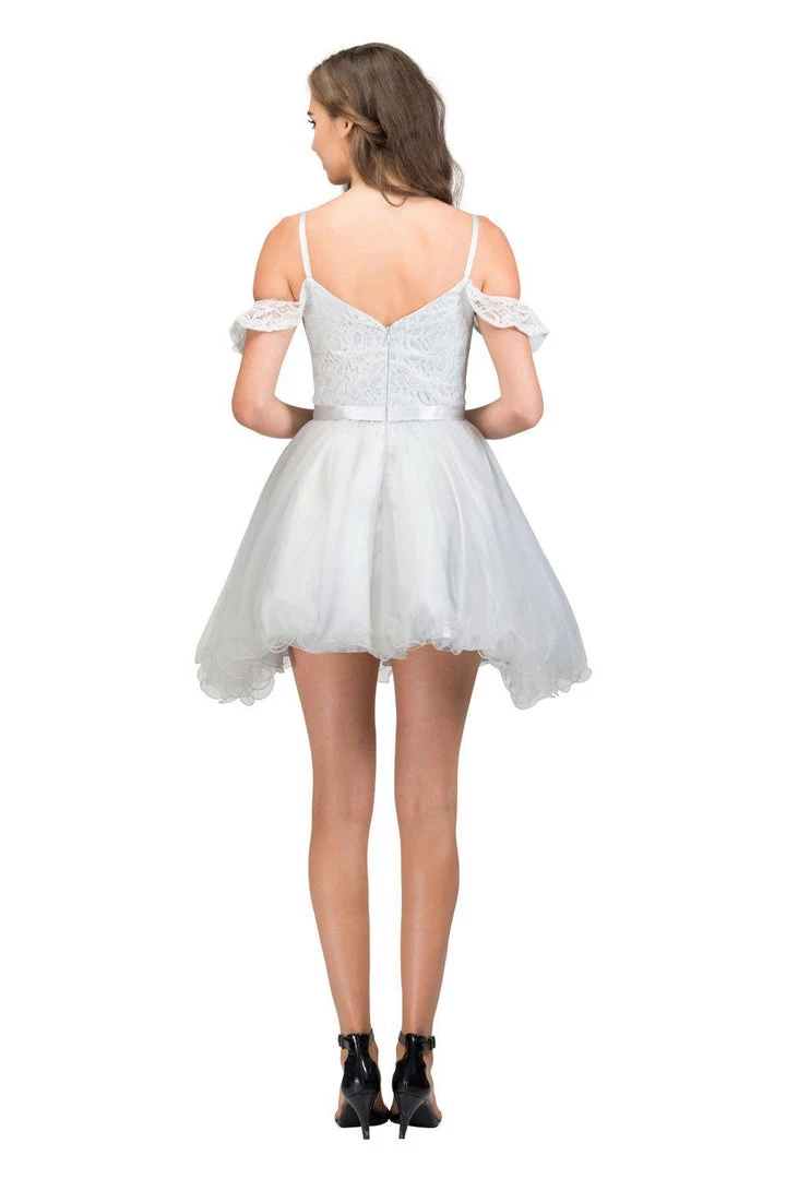 Jaw-dropping off-shoulder party dress blossomsĀ intoĀ floralsĀ fromĀ a Ravenās lace bodiceĀ wrapped in aĀ shimmering satinĀ sash.