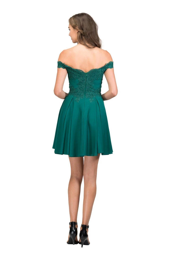 Alluring off-the-shoulder cocktail dress embellished with an elegant lace bodice presents a lovely vision of what dreams may become.