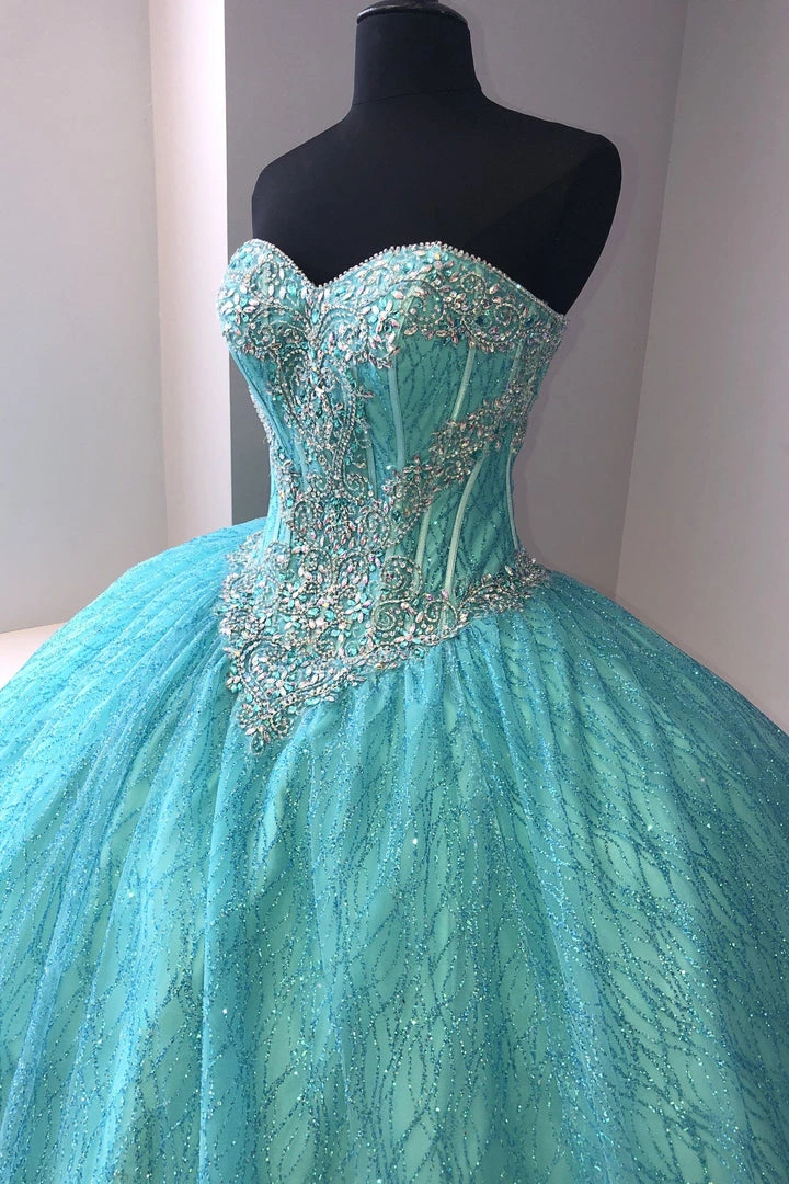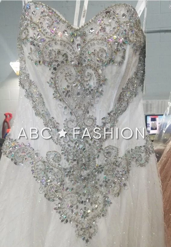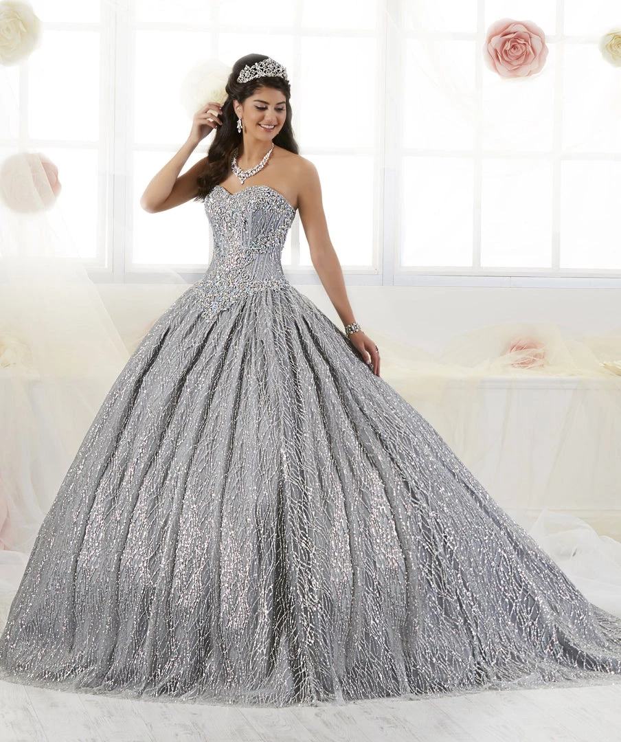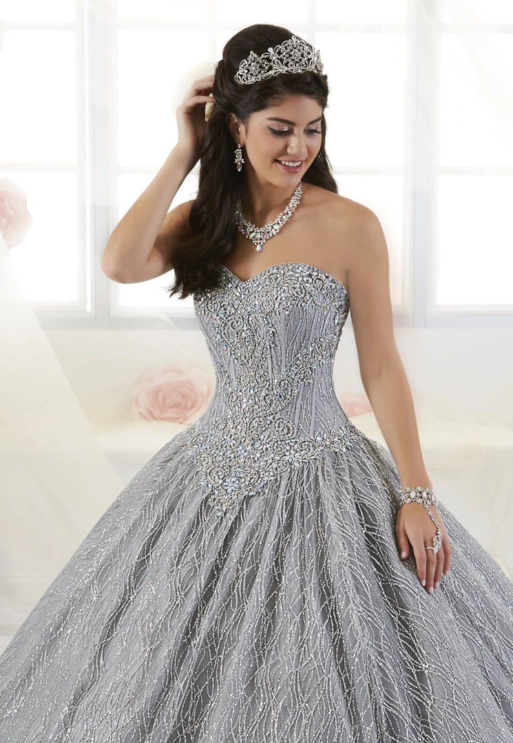 Be the belle of the ball in this all-over glitter tulle princess gown by House of Wu Quinceanera Collection 26896. The strapless sweetheart neckline is accented with corset boning and crystal beading for a touch of drama. This look is complete with a lace up back.