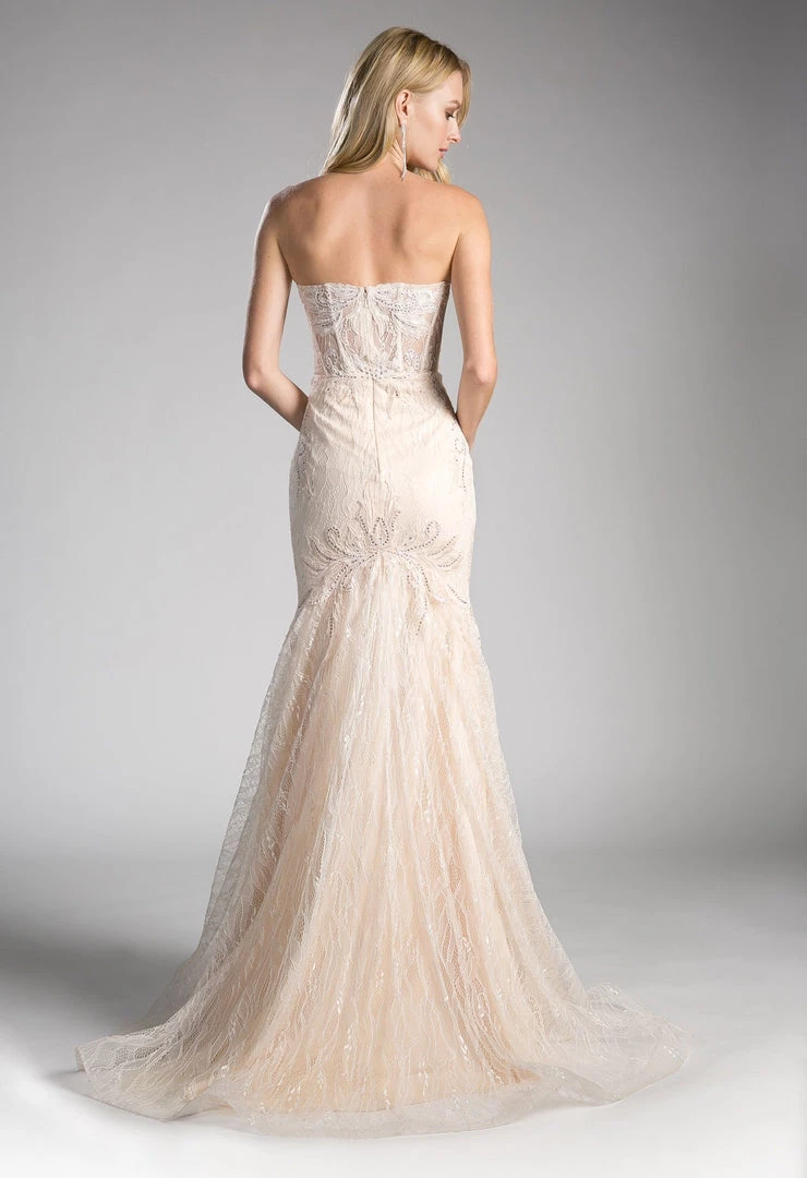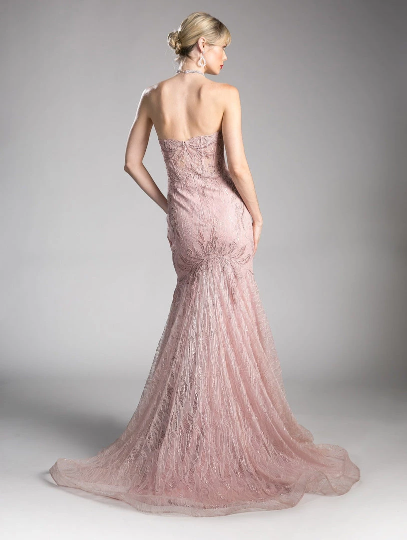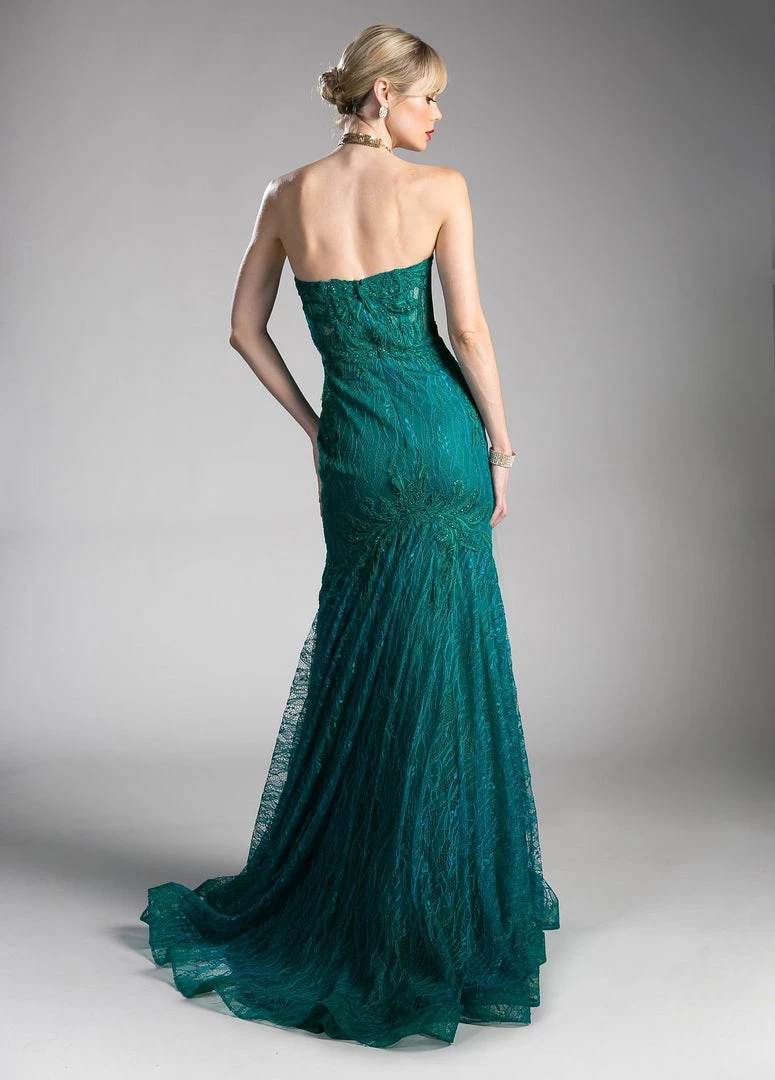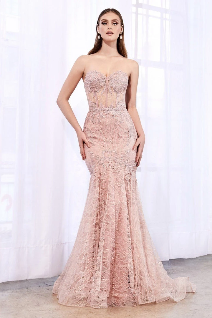 Command attention in this strapless mermaid lace formal gown with illusion appliqued bodice by Cinderella Divine KC19010. This fitted evening gown features a strapless illusion sweetheart boned bodice embroidered with beautiful lace appliques, embellished sheer back, floor length mermaid skirt with train, and a zipper closure.