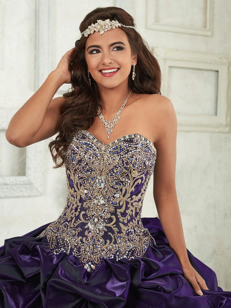 Look timeless in this beaded long strapless sweetheart satin dress with A-line pick-up skirt by House of Wu Quinceanera Collection 26831. An eye-catching sweetheart bodice done in an array of AB rhinestones and metallic embroidery. The skirt has a satin overlay with pickups and slight train, framing a shimmering, front sparkle-tulle panel with embroidered appliqués near the hem. This look is finished with a lace-up corset back and a sweep train.