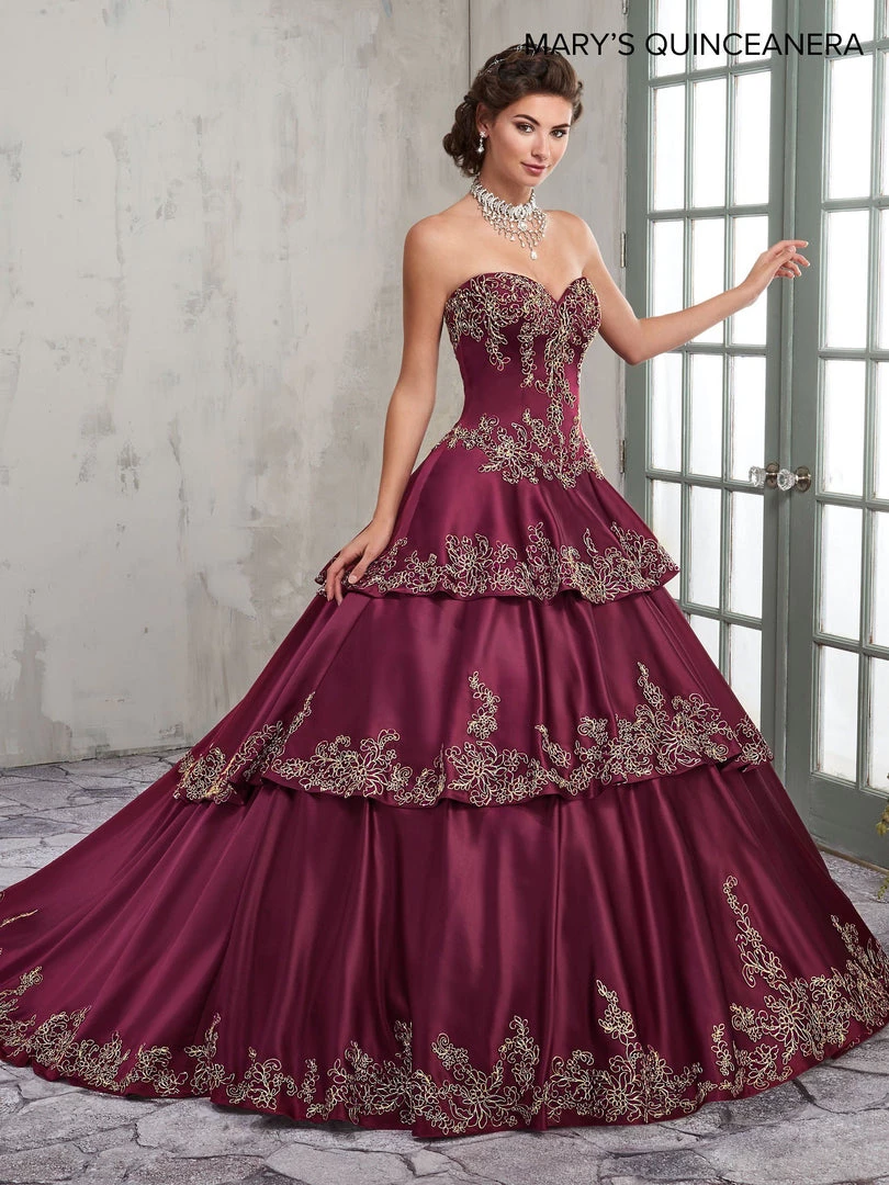 Make a grand entrance in this embroidered long strapless sweetheart dress with A-line skirt by Mary’s Bridal MQ2001. This strapless satin quinceanera ball gown features sweetheart neckline, 3-tiered skirt, gold embroidery, back lace-up closure, train, and comes with a matching bolero jacket.