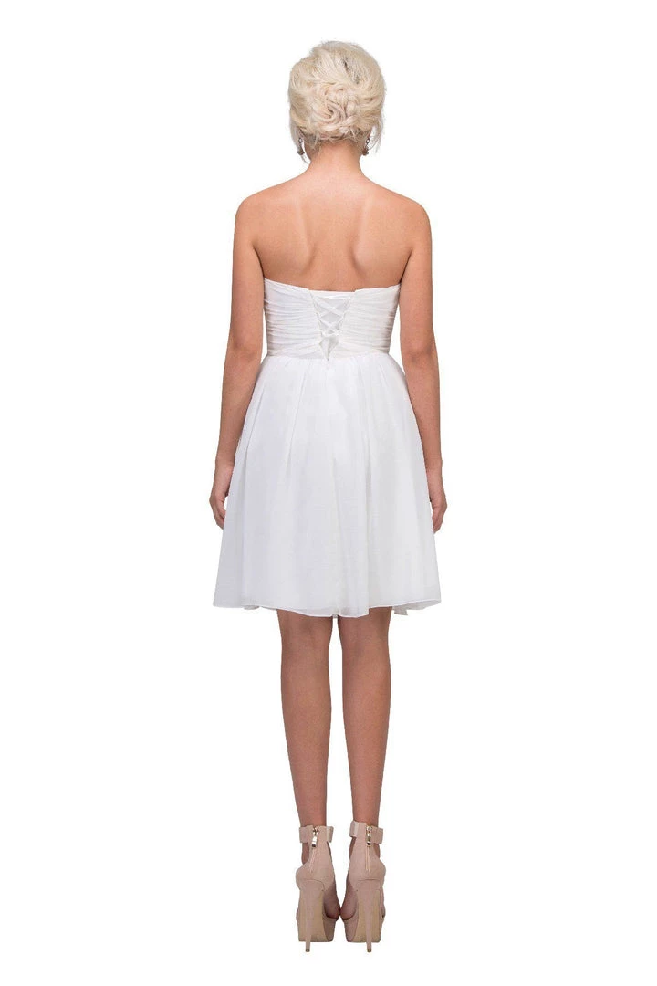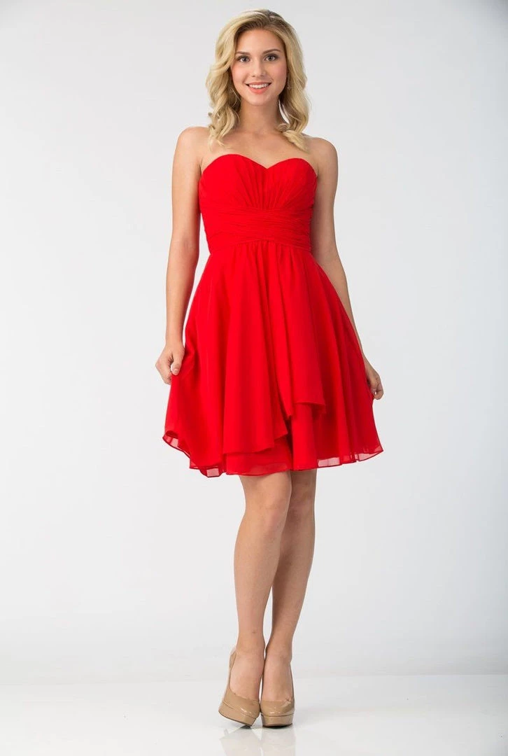 Look super cute in this ruched strapless sweetheart knee-length cocktail dress with corset back by Star Box 6074. This beautiful short empire waist dress features a pleated bodice, strapless sweetheart neckline, layered short A-line skirt that gracefully falls at the knees, and a lace-up corset back with zipper closure. Affordably priced at $120, this short party dress is perfect for any formal event and will keep you on budget!