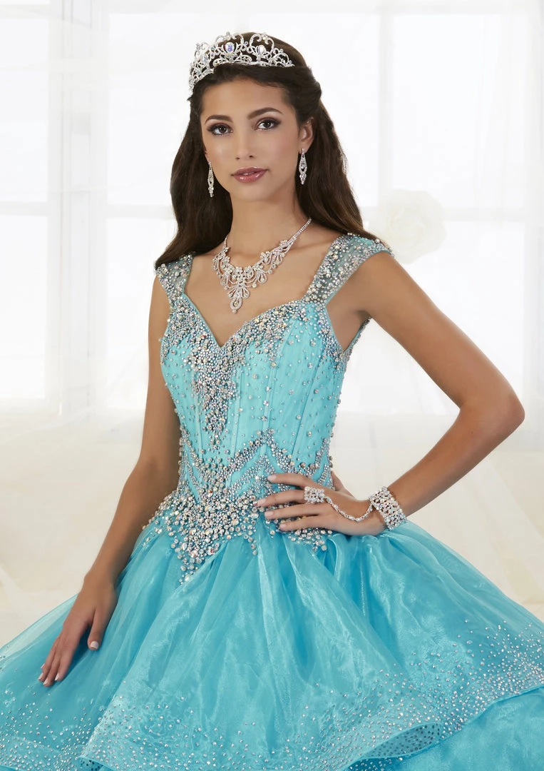 Look and feel glamorous in this beaded cap sleeve tiered ball gown by House of Wu 26880. A marvelous, organza, multi-tier skirt brazenly decorated with sparkling rhinestone banners on its horsehair hems, including the train. This Quince dress features a lively and extravagant bodice drizzled in iridescent AB beads, and attached with beaded illusion straps, which brings this tasteful gown to a fine finish.