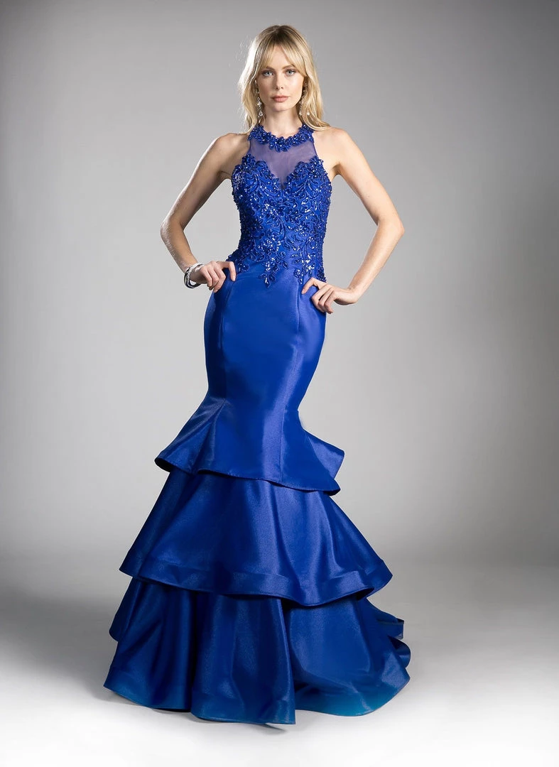 Look like a Hollywood starlet in this long tiered royal blue mermaid dress with beaded embroidery by Cinderella Divine CC7088. This satin evening gown features a sheer high-neck sleeveless bodice adorned with dazzling beaded appliques that cascades to the natural waistline, embellished open back with cut outs, a floor length tiered mermaid skirt with a small train, and a zipper closure.