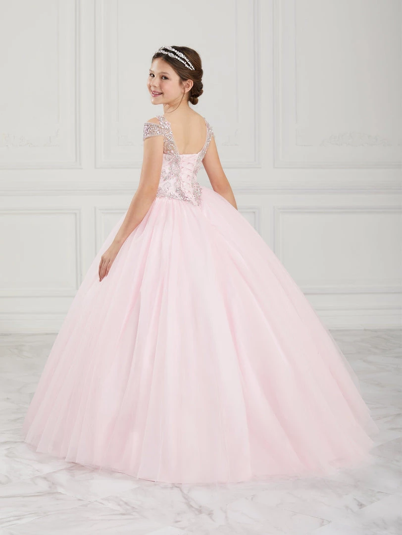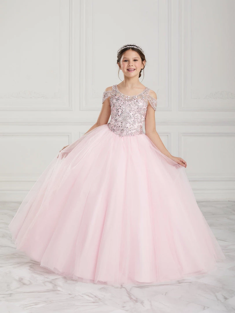 Your sweet girl will look picture-perfect in this beaded long cold shoulder dress with A-line skirt by Tiffany Princess 13621. Made out of tulle, this beautiful ball gown features a sheer cold shoulder scoop bodice adorned with sparkly beads, beaded cap sleeves, partial open back, and a floor length skirt. This look is finished with a lace-up corset back and sweep train.