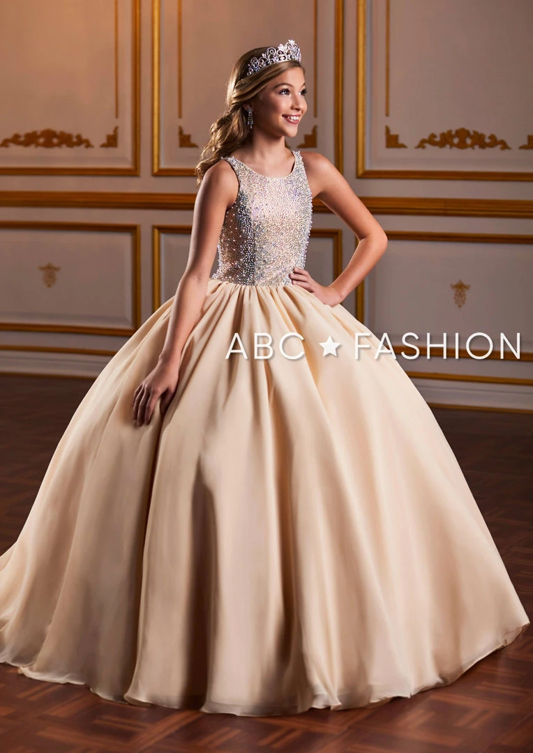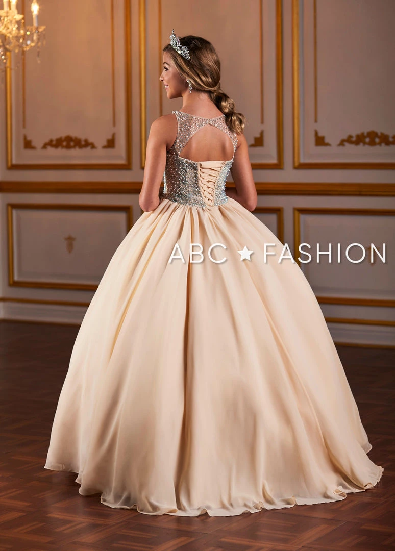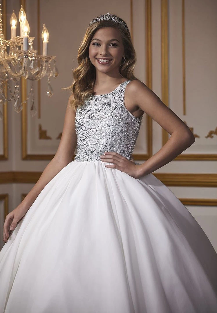 Your sweet girl will look timeless in this long sleeveless chiffon dress with A-line skirt by Tiffany Princess 13572. This beautiful ball gown features a sleeveless scoop neck bodice adorned with sparkly beads, beaded shoulder straps, open back with keyhole cutout, a floor length A-line skirt, sweep train, and a lace-up corset back.