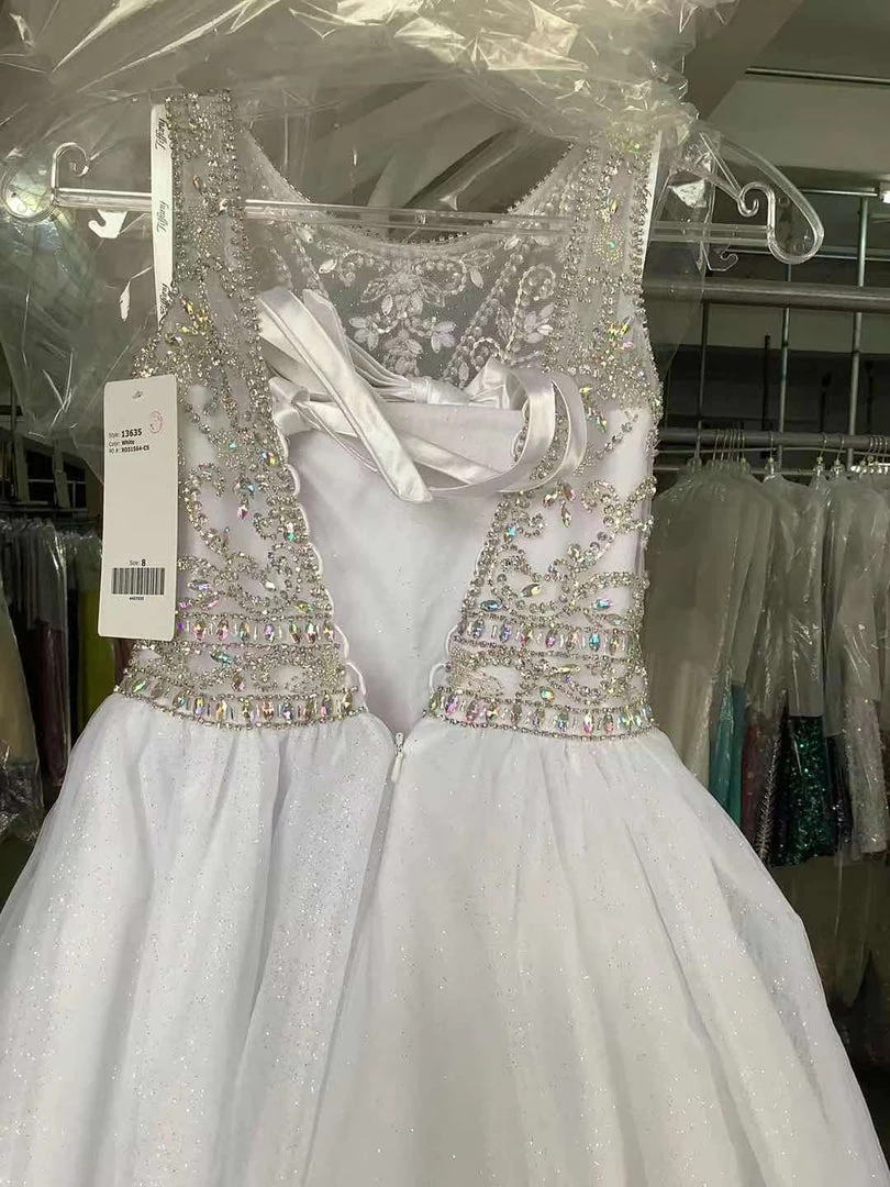 Your sweet girl will light up the room in this beaded long sleeveless illusion dress with A-line skirt by Tiffany Princess 13635. Illusion neckline with beaded bodice and waistband and gathered A-line tulle skirt. This beautiful gown is finished with a lace-up corset back and a sweep train.