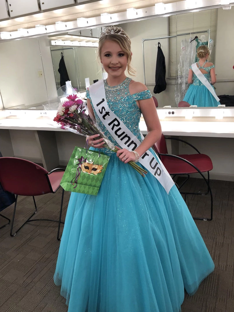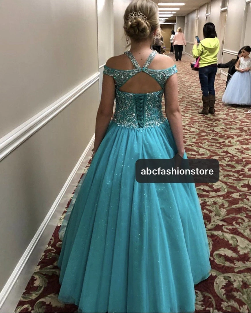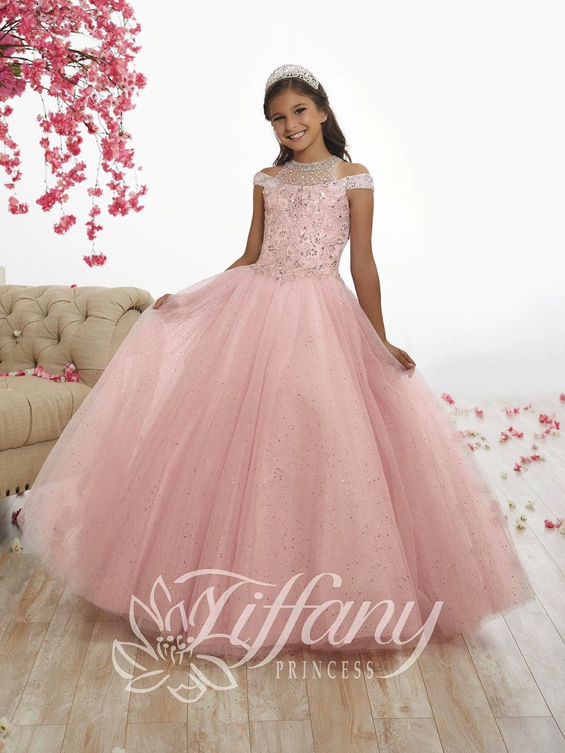Your precious girl will love twirling around in this beaded long cold shoulder dress with A-line skirt by Tiffany Princess 13525. This gown mixes a bateau neckline with illusion beaded bodice, sweetheart lining, and a cold shoulder detail. Offers a full, tulle ball gown skirt. Open back with lace-up.