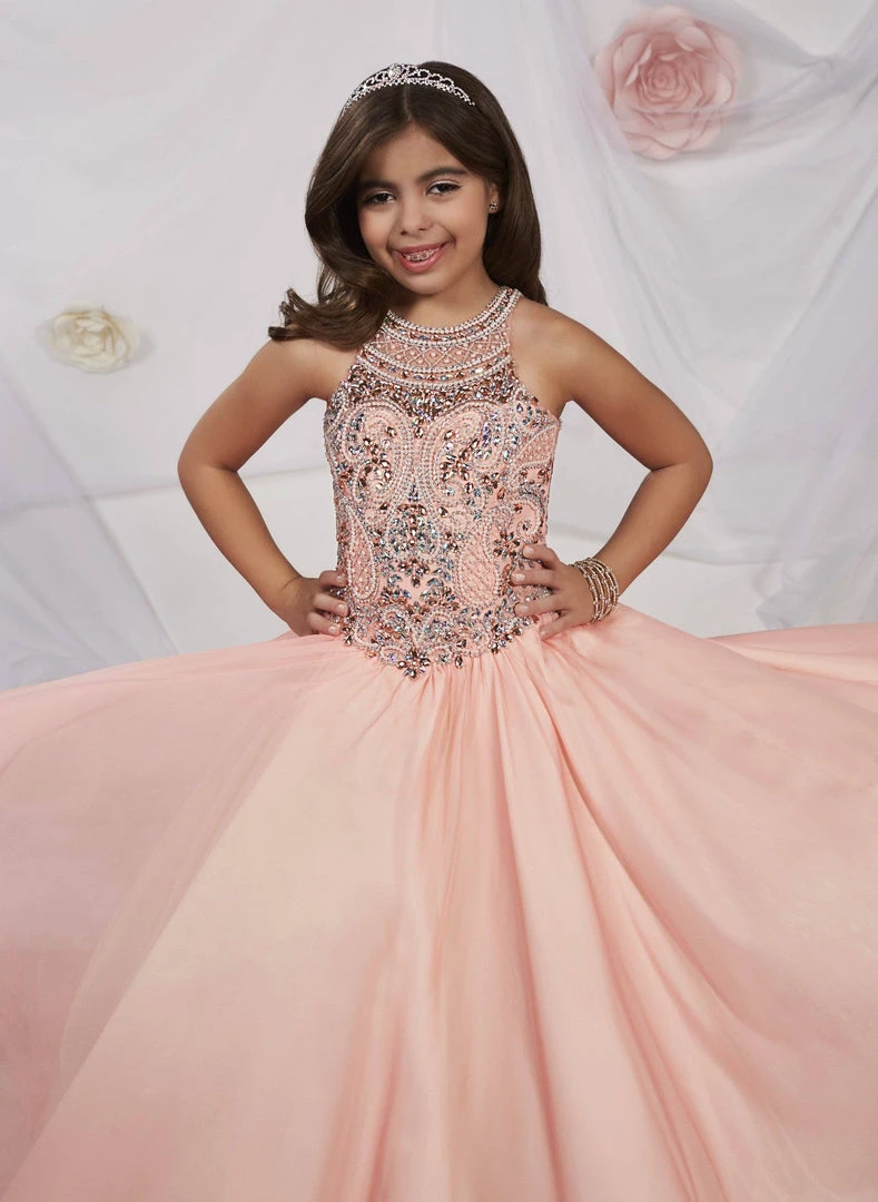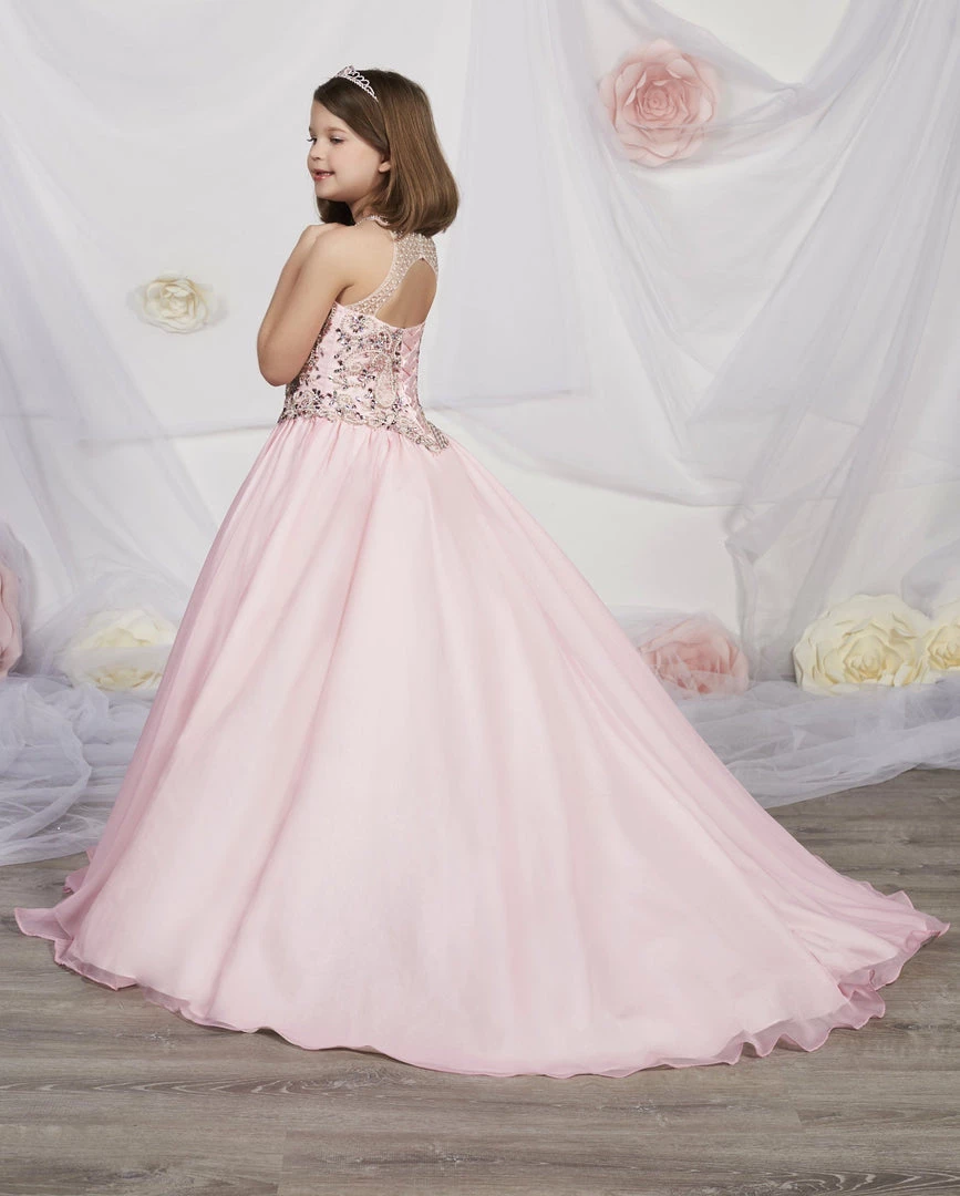 Your precious girl will love dancing the night away in this long beaded illusion chiffon dress with A-line skirt by Tiffany Princess 13534. This ball gown highlights a beautiful sleeveless bodice with an illusion scoop neckline adorned with sparkly rhinestone beading accented with sequins and pearls. The A-line skirt is made of chiffon with a lace-up back.