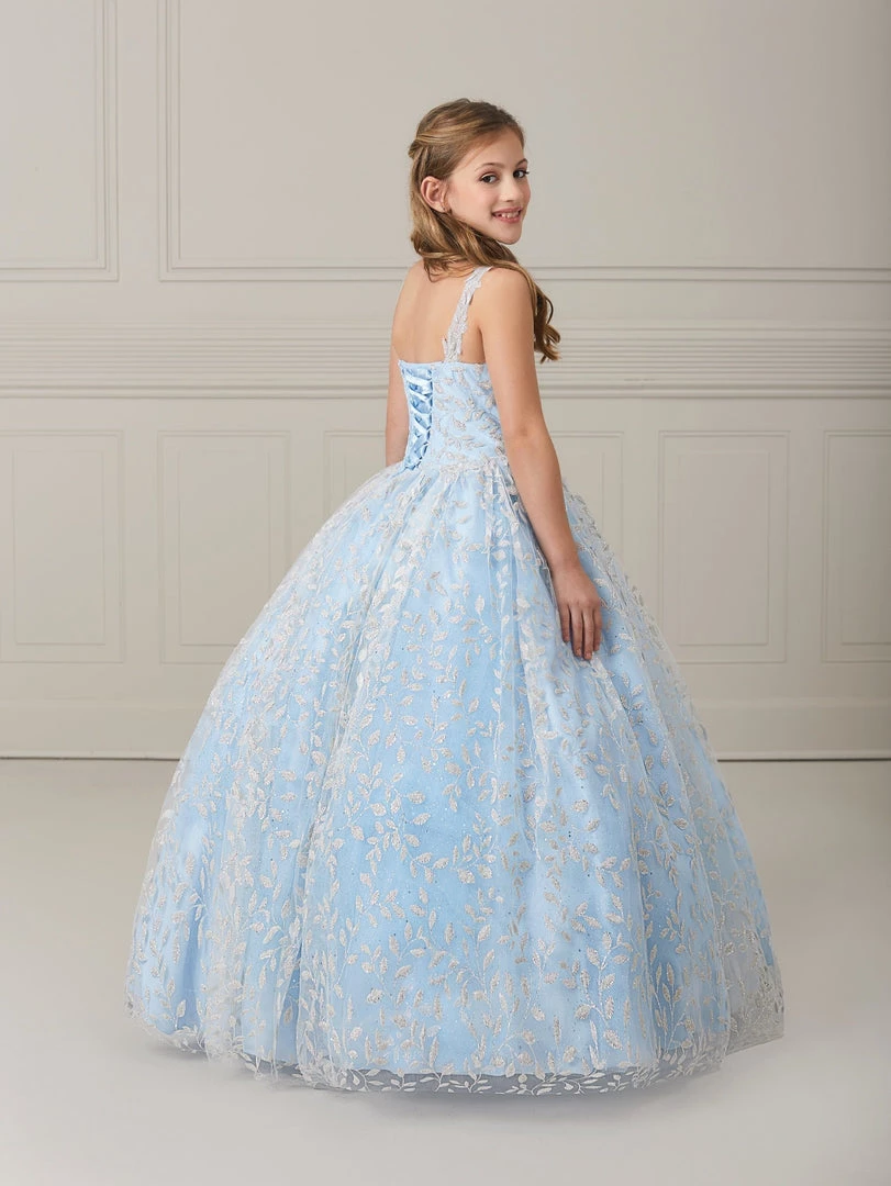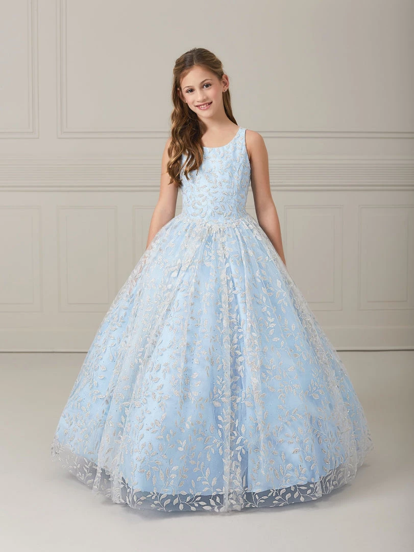 Your sweet girl will dazzle the room in this long sleeveless floral glitter dress with A-line skirt by Tiffany Princess 13637. Embellished with floral glitter, this beautiful ball gown features a scoop neckline with glitter dots on tulle and gathered tulle A-line skirt. This look is finished with a lace-up corset back.