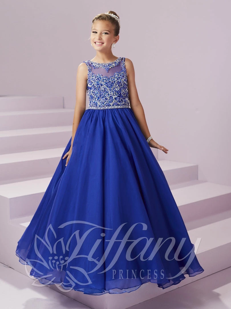 Your sweet girl will love twirling around in this beaded long sleeveless illusion dress with A-line skirt by Tiffany Princess 13496. This ultimate Princess gown features a beautiful illusion beaded bodice and waistband, chiffon A-line skirt, and a lace-up back.