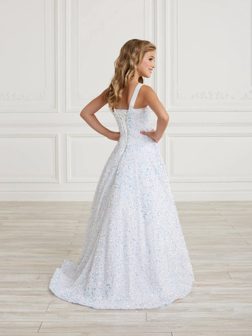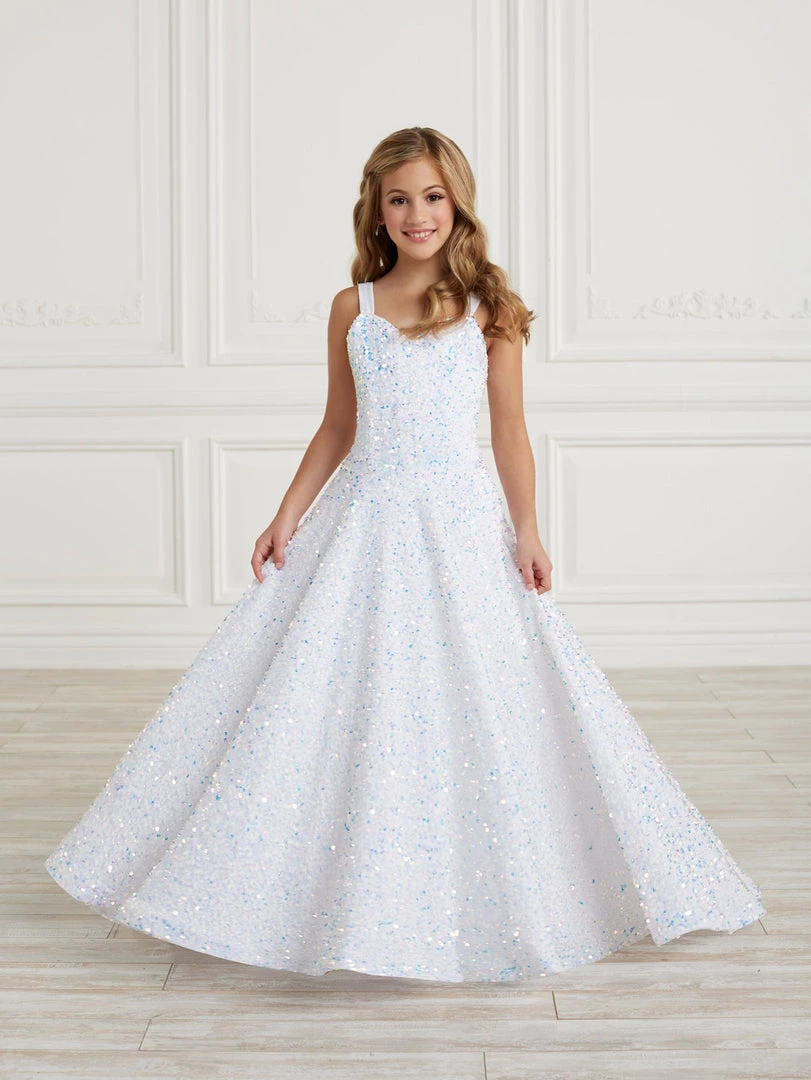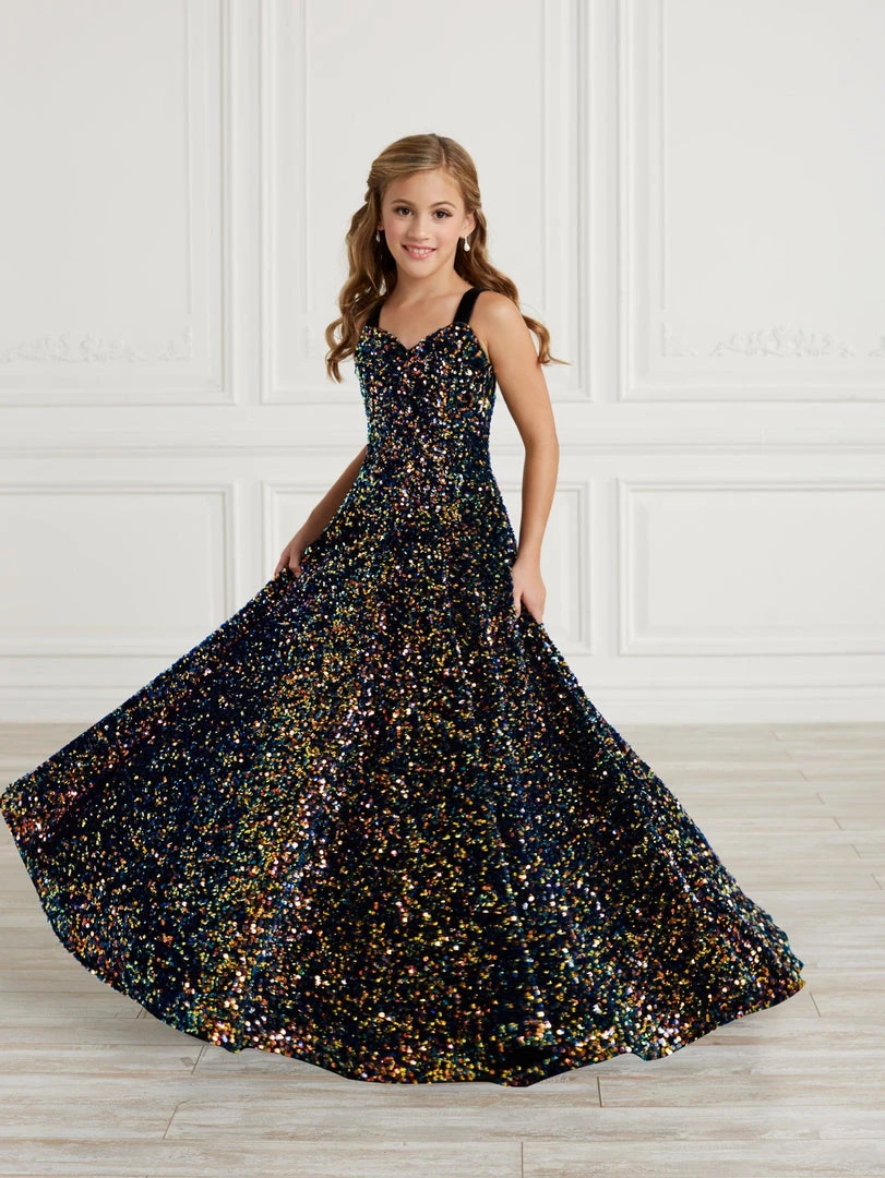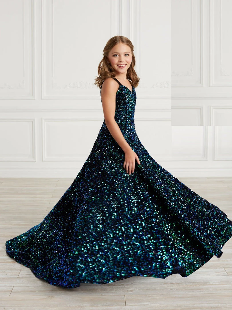 Your sweet girl will dazzle the room in this long sleeveless iridescent sequin dress with A-line skirt by Tiffany Princess 13625. Embellished with iridescent sequins, this beautiful ball gown features a sleeveless sweetheart bodice, velvet straps, open back, and a floor length skirt with side pockets. This look is finished with a lace-up corset back and sweep train.