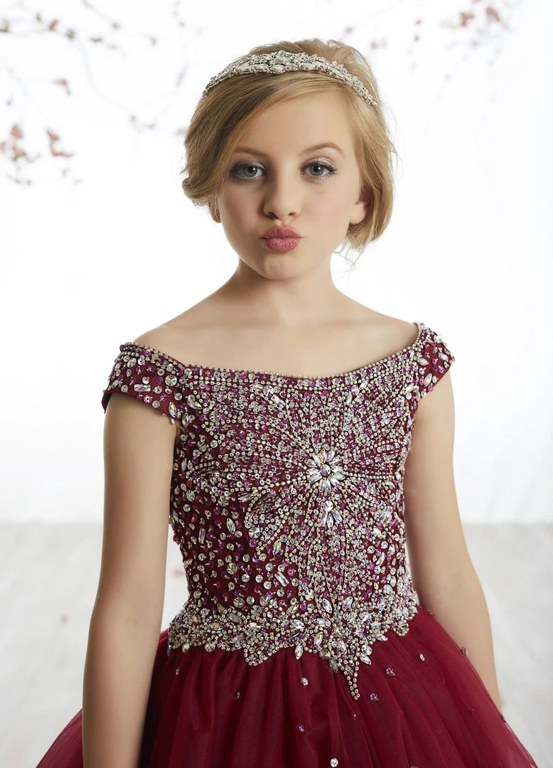 Your sweet girl will sparkle in this beaded long off the shoulder dress with A-line skirt by Tiffany Princess 13505. This beautiful gown features an off the shoulder neckline, rhinestones beaded bodice, and gathering tulle A-line skirt. Lace-up back.