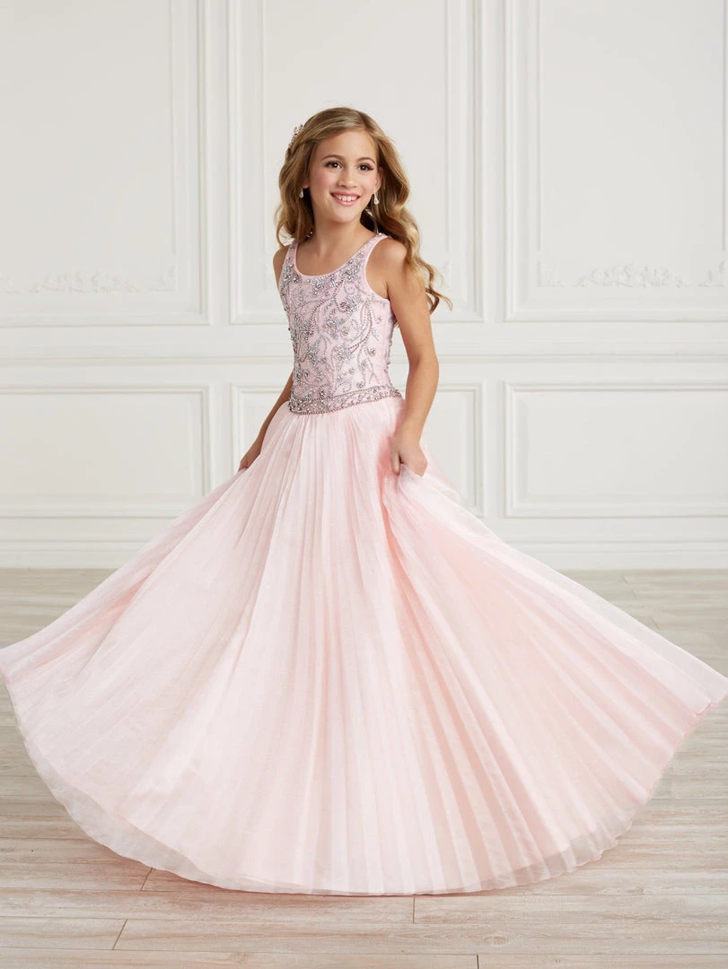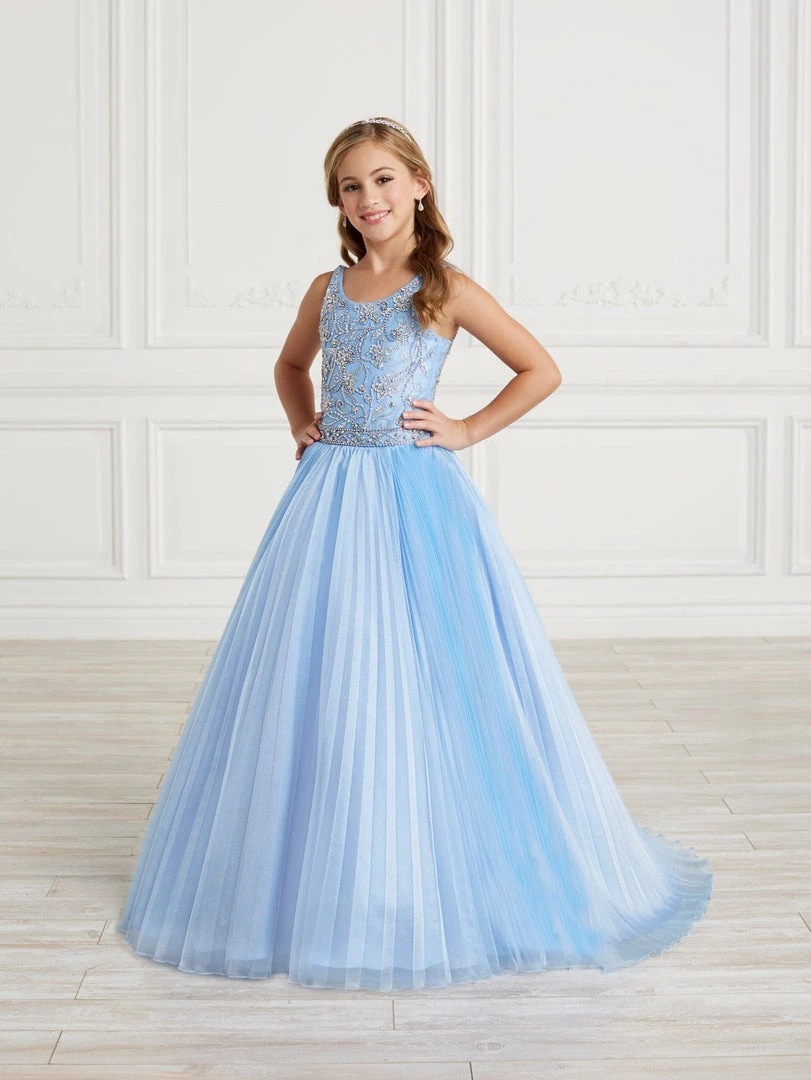 Your sweet girl will beam with joy in this beaded long sleeveless dress with pleated A-line skirt by Tiffany Princess 13628. Made out of organza, this beautiful ball gown features a sleeveless scoop neck bodice adorned with sparkly beads, open back, and a floor length pleated skirt with side pockets. This look is finished with a lace-up corset back and sweep train.