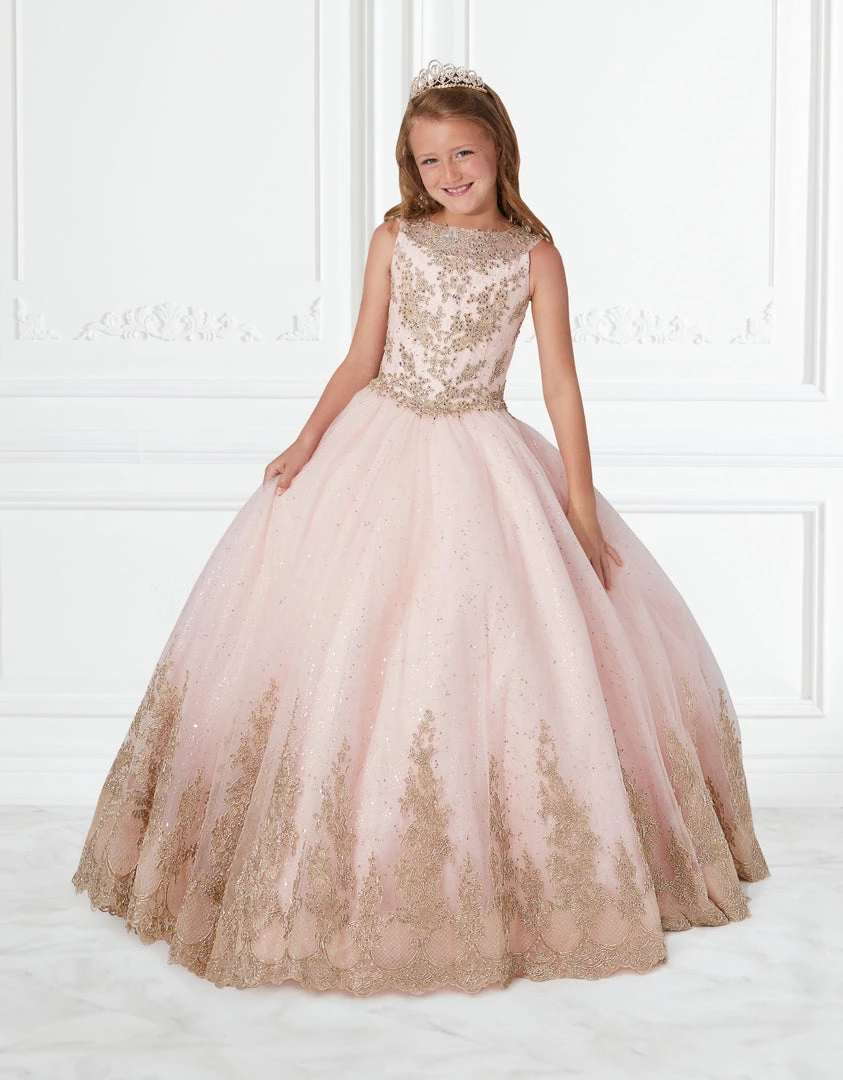 Your sweet girl will look timeless in this lace appliqued long sleeveless dress with A-line skirt by Tiffany Princess 13598. Made out of tulle, this beautiful ball gown features a sleeveless illusion bodice adorned with heat-set beaded lace appliques, open back with cutout, a floor length A-line skirt embellished with lace appliques, sweep train, and a lace-up corset back.
