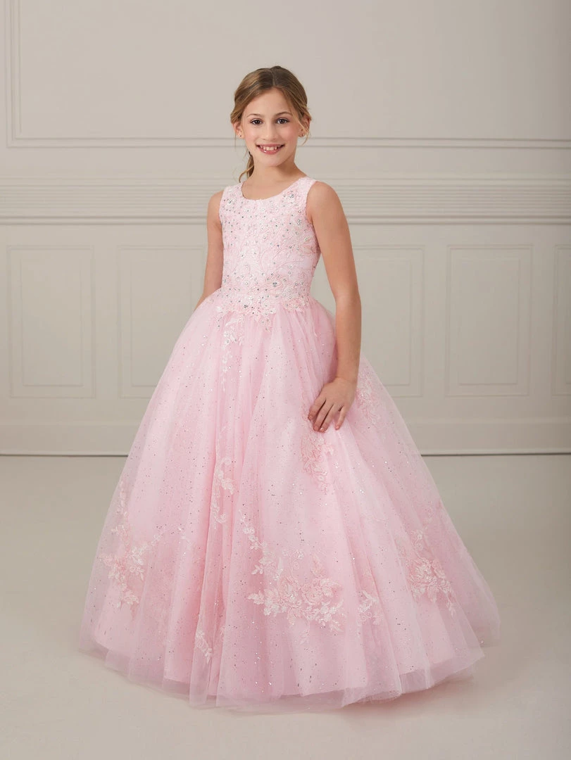 Your sweet girl will love twirling around in this long sleeveless floral applique dress with A-line skirt by Tiffany Princess 13650. Scoop neckline with floral lace applique bodice and glitter tulle A-line skirt. This beautiful gown is finished with a lace-up corset back and sweep train.