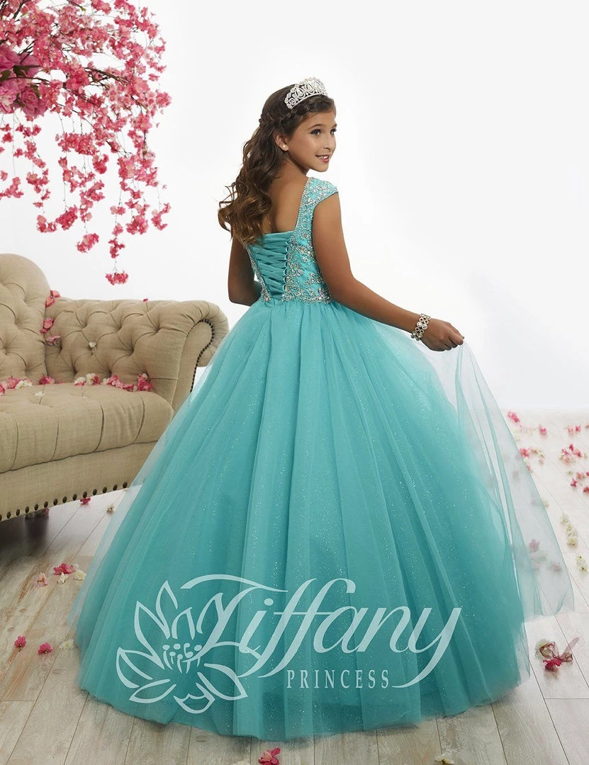 Your sweet girl will love twirling around in this beaded long cap sleeve dress with A-line skirt by Tiffany Princess 13521. We adore this off the shoulder, rounded neckline dress with a beaded appliquƩ bodice, full tulle skirt, and lace-up back.
