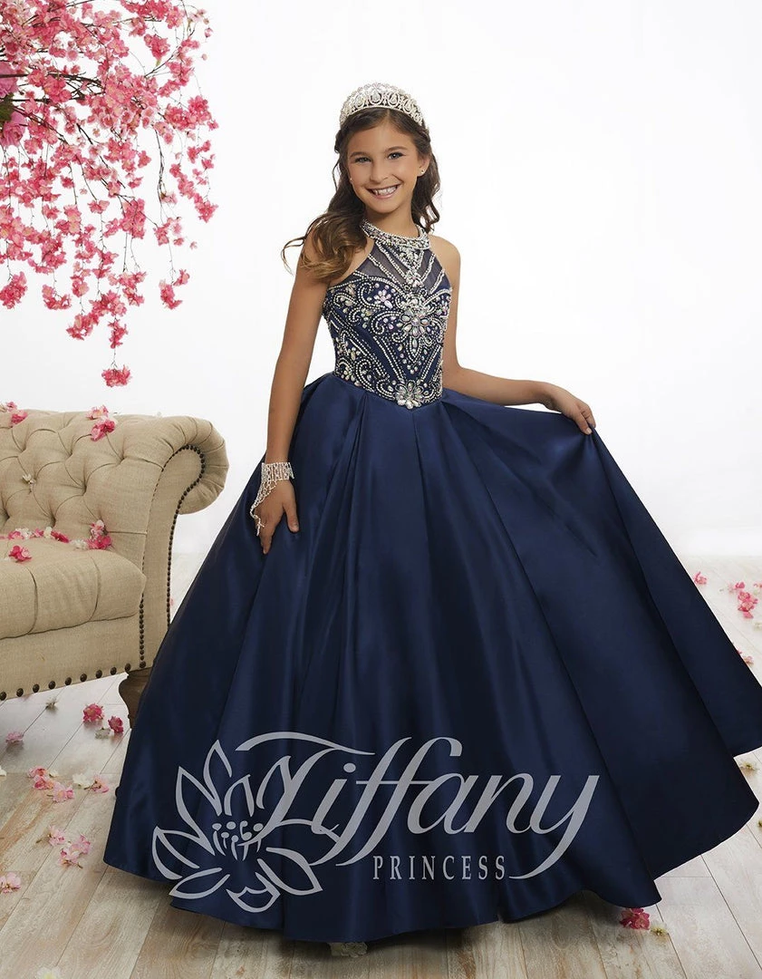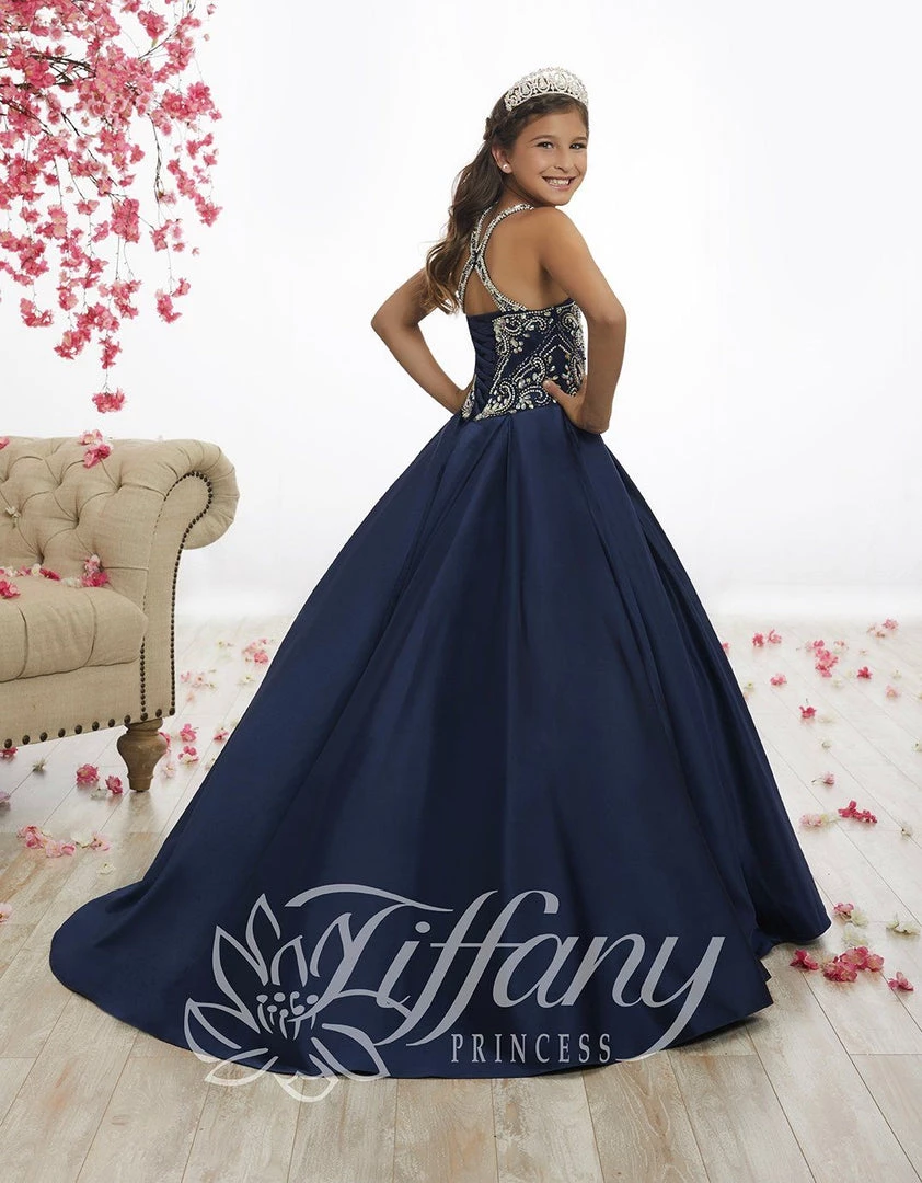 Your little miss will receive lots of compliments in this beaded long illusion halter dress with A-line skirt by Tiffany Princess 13528. This beautiful dress features lovely swirls of baroque bead work that cover the glorious bodice, rising and racing across the halter neckline and straps. Complete with a full box pleated A-line satin skirt. And lace-up back with sweep train.