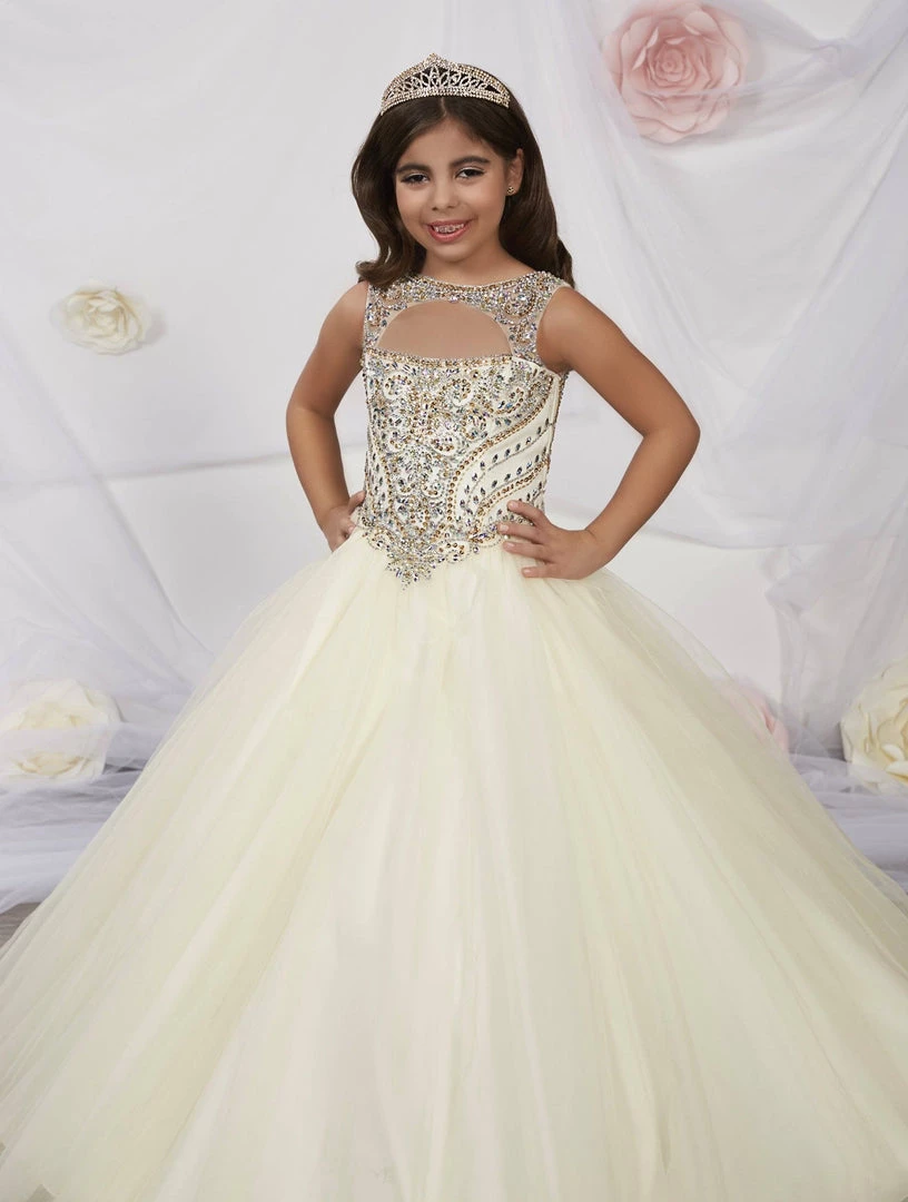 Your precious girl will dazzle the room in this long beaded two-tone tulle dress with A-line glitter skirt by Tiffany Princess 13544. This dramatic ball gown features a bejeweled corset, a lace-up back, scoop illusion neckline, and two-tone tulle and sparkle A-line tulle skirt.