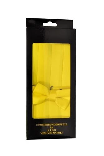 Add a special touch to any boy’s tuxedo or uniform with this yellow cummerbund and pre-tied bow tie set. Cummerbund measures 14.5 inch width by 4.5 inch height. Bow tie measures 4 inch width by 1.5 inch height. This yellow cummerbund will accentuate his tuxedo and is great for any formal event.