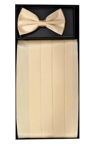 Add a special touch to your tuxedo or uniform with this ivory cummerbund and pre-tied bow tie set. This ivory cummerbund will accentuate your tuxedo and is great for any formal event.