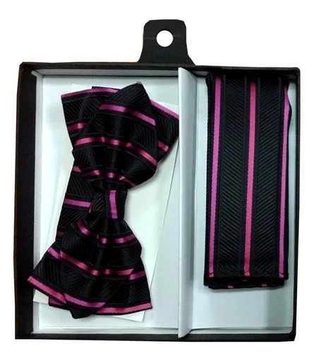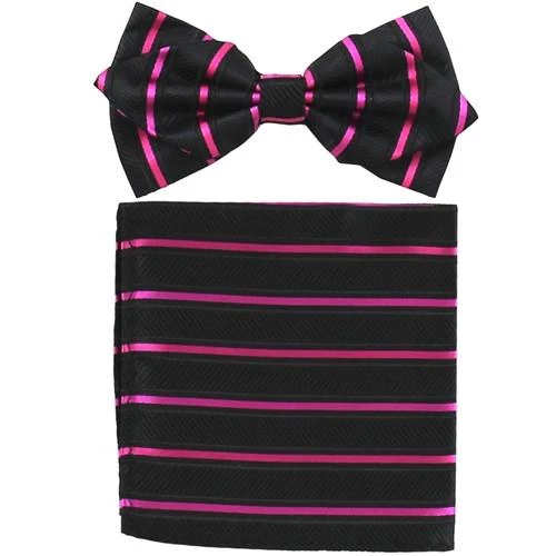 Easily accentuate your style with this black and fuchsia striped bow tie and matching pocket square. Made out of polyester, this pointed tip woven bow tie features textured fuchsia stripes. This bow tie and pocket square set comes packaged in a nice box, so it makes a great gift for men!