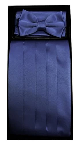 Add a special touch to your tuxedo or uniform with this 3-piece navy blue cummerbund, pre-tied bow tie, and handkerchief set. This navy blue cummerbund will accentuate your tuxedo and is great for any formal event.